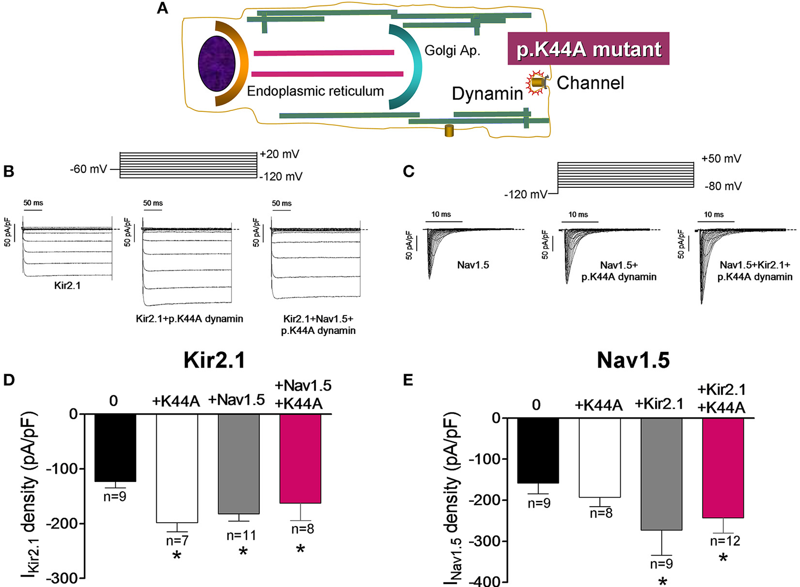 Effects of the dynamin-2 inhibition on Kir2.1 and Nav1.5 channels internalization. (A) Schematic representation of a cell highlighting the role of dynamin-2 in ion channel endocytosis. (B,C) IKir2.1(B) and INav1.5(C) traces recorded by applying the protocols shown at the top in CHO cells transfected with the constructs indicated. The dashed lines represent the zero current level. (D,E) Bar graphs depicting IKir2.1 density at −120 mV (D) and peak INav1.5(E) in cells expressing Kir2.1 and Nav1.5 channels, respectively in the absence or presence of the constructs indicated cotransfected or not with p.K44A dynamin-2. Each bar represents the mean ± SEM of “n” experiments of ≥3 preparations. *P < 0.01 vs. cells transfected with Kir2.1 or Nav1.5 channels alone. For clarity the results of other statistical comparisons were not shown.