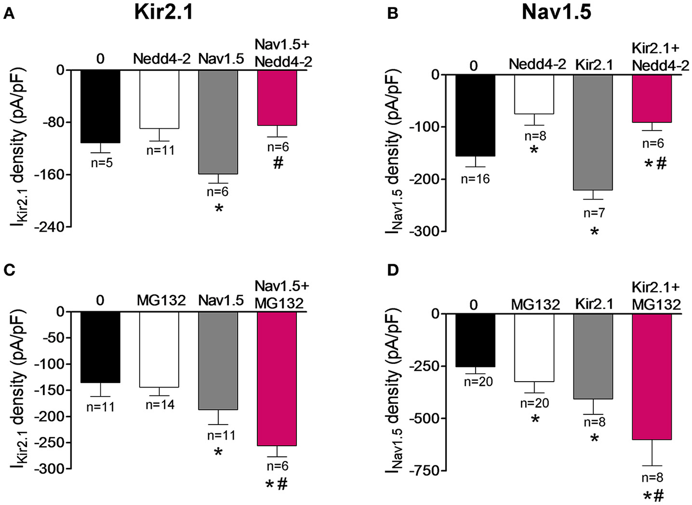 Kir2.1 and Nav1.5 channel complexes are ubyquitinated and degraded by the proteasome. (A,B) IKir2.1 density at −120 mV (A) and peak INav1.5(B) recorded in cells expressing Kir2.1 and Nav1.5 channels cotransfected or not with the ubiquitin ligase Nedd4-2. (C,D) IKir2.1 density at −120 mV (C) and peak INav1.5(D) recorded in cells expressing Kir2.1 and Nav1.5 channels incubated or not with the proteasome inhibitor MG132 (2 μM for 2 h). Each bar represents the mean ± SEM of “n” experiments of ≥4 preparations. *P < 0.05 vs. cells transfected with Kir2.1 or Nav1.5 channels alone; #P < 0.05 vs. cells transfected with Kir2.1+Nav1.5. For clarity the results of other statistical comparisons were not shown.