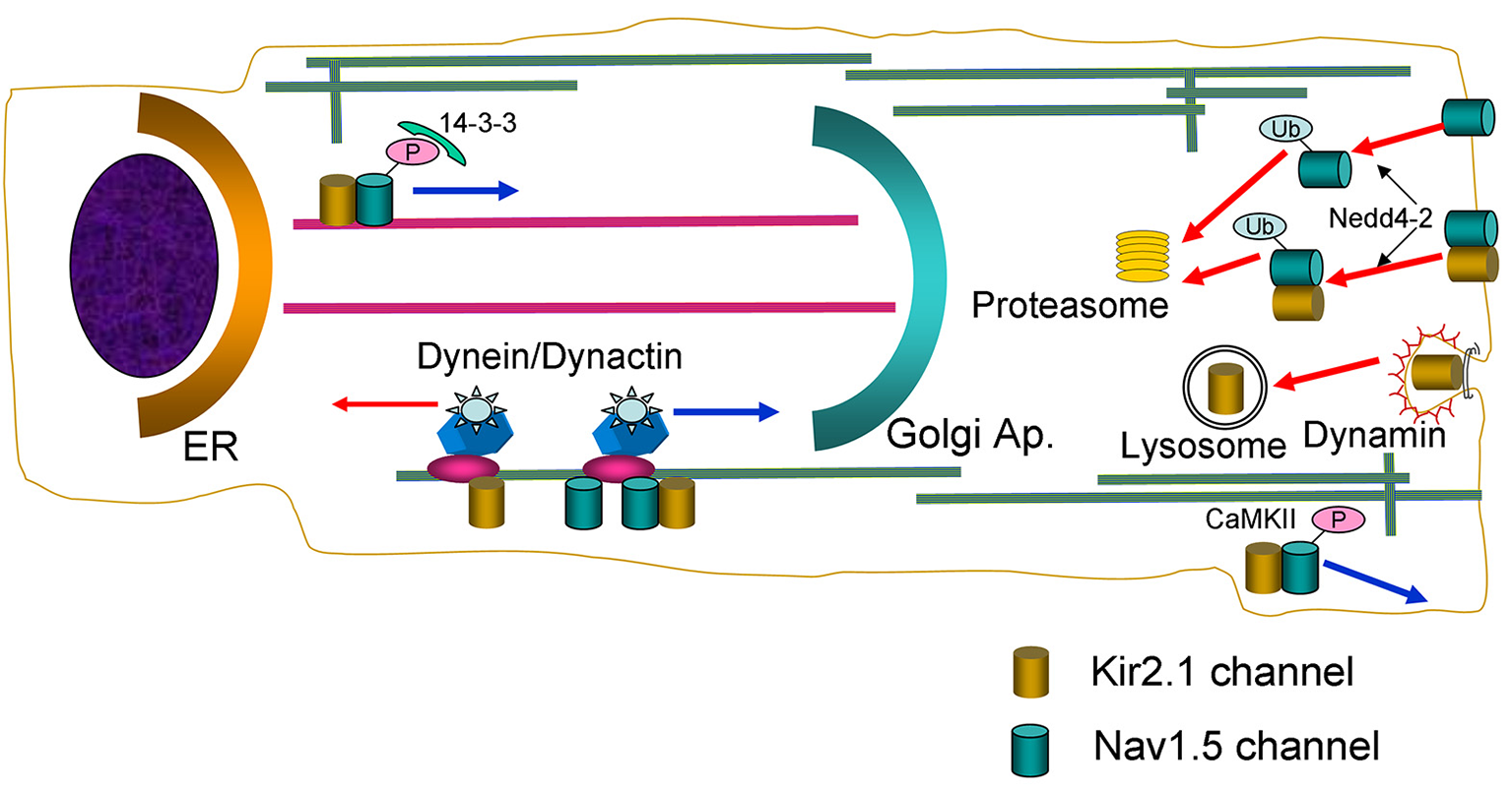Schematic diagram summarizing the main findings of the present study. Nav1.5 and Kir2.1 channels are represented by green and golden cylinders, respectively. ER, endoplasmic reticulum; P, phosphate; Ub, ubiquitin chains.