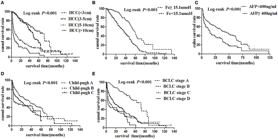 Figure 3. Cumulative survival plotted using the Kaplan-Meier survival curves and compared using log-rank test. (A) HCC patients with tumor size <3 cm (dashed line) had better overall survival than those with tumor size 3–5 cm (bold solid line), 5–10 cm (dotted line), or more than 10 cm (solid line) (P < 0.001). (B) HCC patients with higher serum iron levels (dashed line) had better overall survival than those with lower serum iron (solid line). (C) HCC patients with AFP < 400 ng/ml (dashed line) had better overall survival than those with AFP ≥ 400 ng/ml (dotted line). (D) HCC patients with Child-Pugh A (dashed line) had better overall survival than those with Child-Pugh B (dotted line), or C (solid line). (E) Patients with BCLC stage A (dashed line) had better overall survival than those with BCLC stage B (bold dashed line), C (dotted line), or D (solid line).