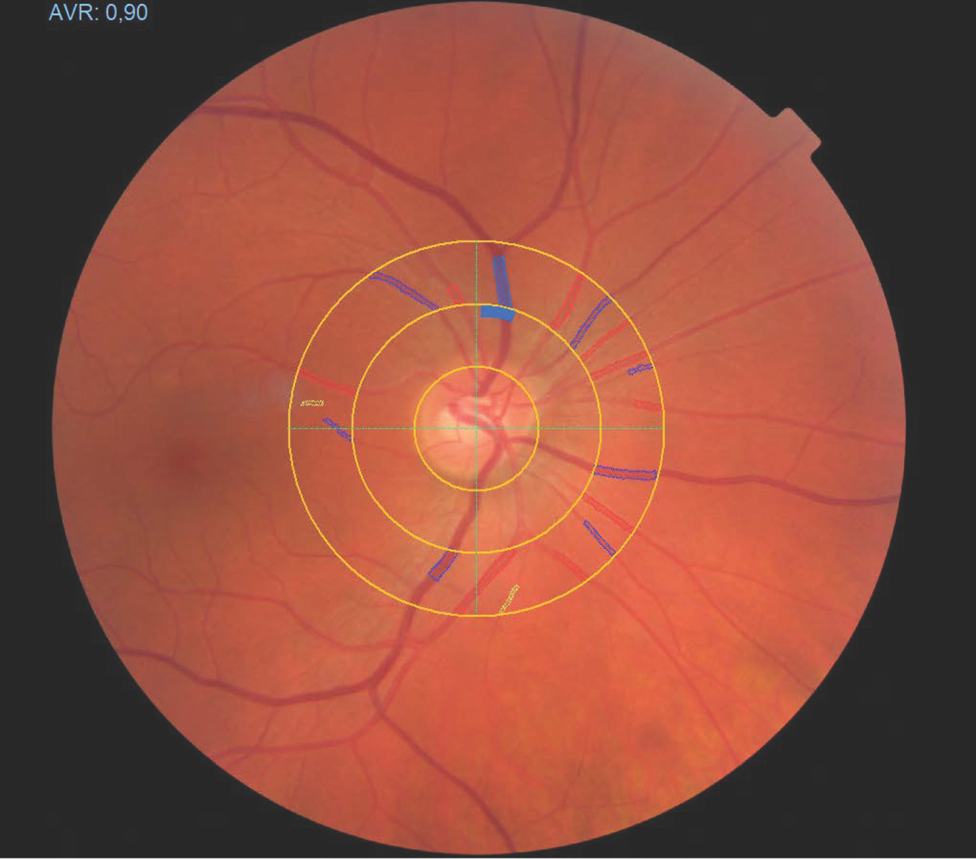 Fundoscopy of the human retina. A software-based identification of retinal vessels in ring-zones allows for measuring of arteriolar and venular diameters.