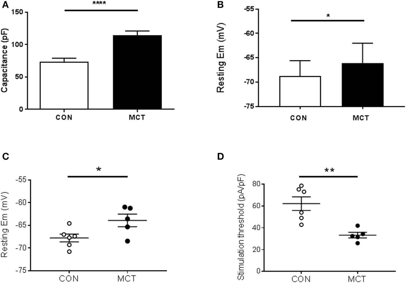 (A) RV myocyte capacitance was greater in MCT myocytes than CON myocytes, consistent with hypertrophy in PAH. (B) Resting membrane potential was more depolarized in MCT than CON myocytes. Resting membrane potential (C) and current density required to trigger an action potential (D) measured in the same cells, were lower in MCT than CON myocytes. (A)n = 15 CON, 20 MCT myocytes, (B), 20 CON, 21 MCT (C,D)n = 6 CON, 5 MCT myocytes, ****P < 0.0001, **P < 0.01, *P < 0.05 unpaired t-test.