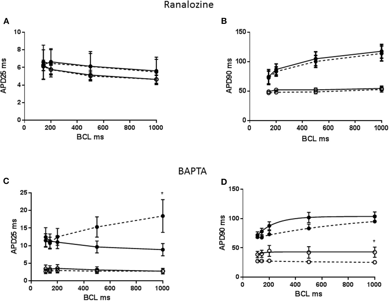 (A) APD25 restitution and (B) APD90 restitution for CON (°) and MCT (•) RV myoctes in the presence (dashed lines) or absence of 5 μM ranolazine. Ranolazine had no effect on APD25 or APD90. (C) APD25 restitution and (D) APD90 restitution for CON (°) and MCT (•) RV myocytes in the presence (dashed lines) or absence of prior exposure to BAPTA. BAPTA lengthened APD25 and reversed the restitution curve in MCT myocytes. In CON myocytes BAPTA reduced APD90 but did not affect APD restitution. n = 6–9 myocytes (A,B), n = 5–6 (C,D). *P < 0.05 vs. ranolazine or BAPTA, two way RM ANOVA.