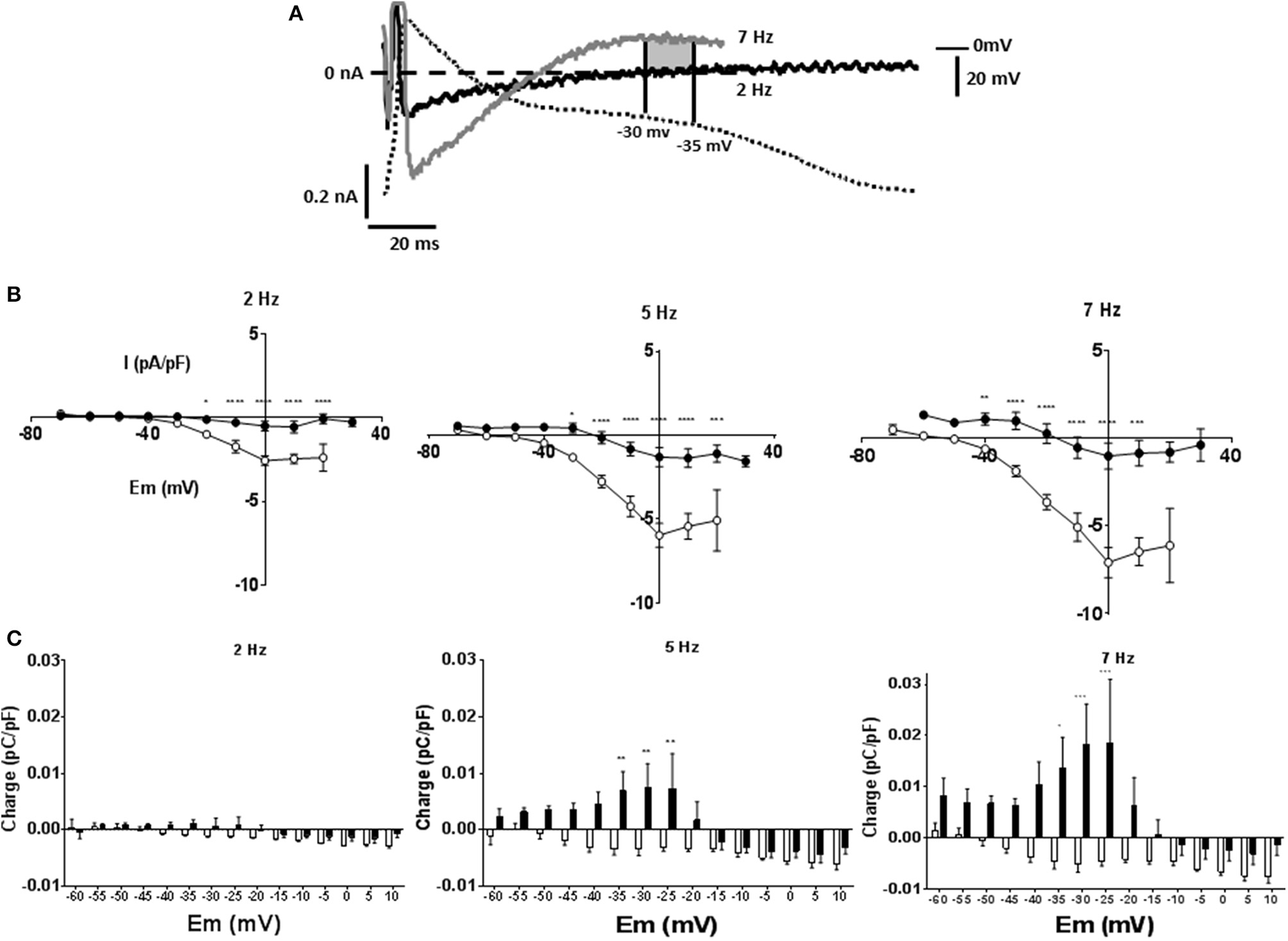 In action potential clamp (AP clamp) experiments, action potentials were recorded at 1 Hz stimulation frequency and this waveform used to voltage clamp that cell at stimulation frequencies between 1 and 7 Hz.