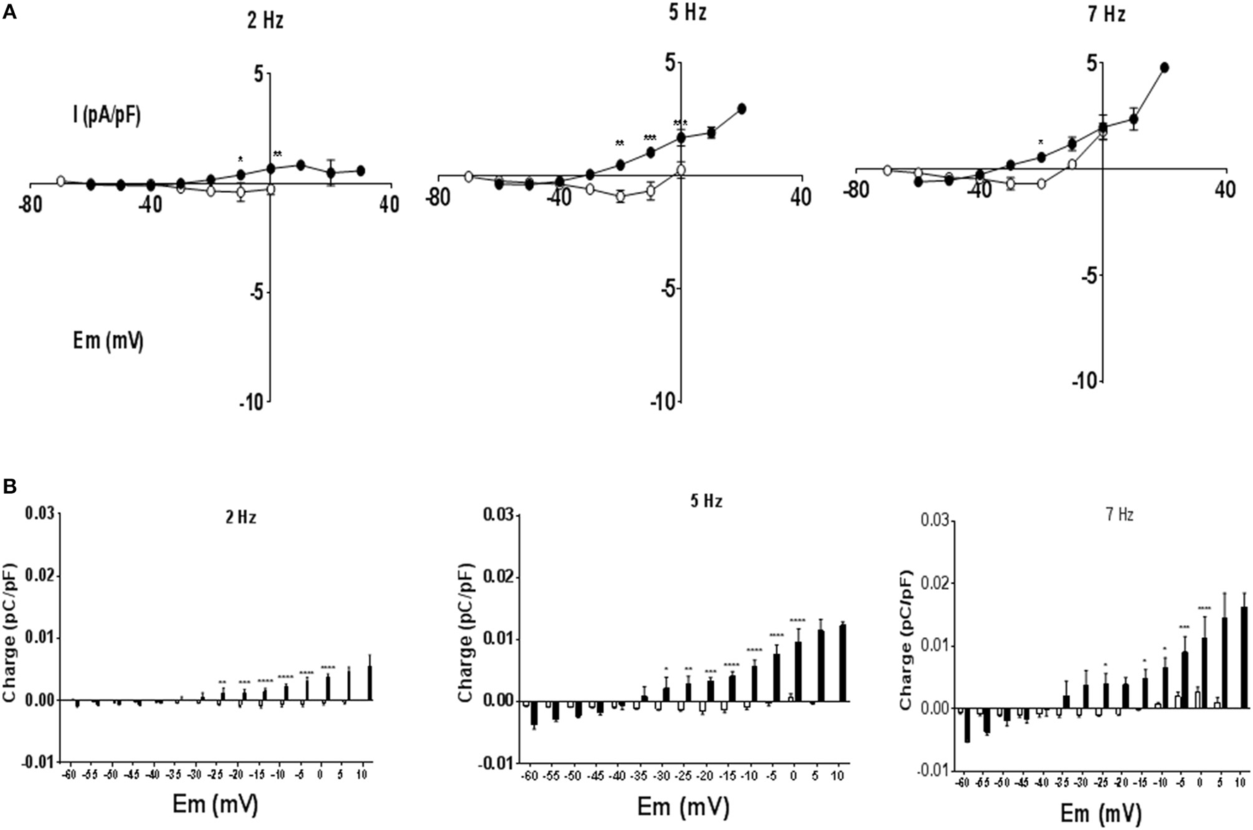 Myocytes were voltage clamped with the waveform of their own action potential recorded at 1 Hz (AP clamp). Stimulation frequency was increased and currents recorded under AP clamp. (A) Experimental traces illustrating the measurement of membrane current and charge described in panels (B,C) and in Figure 5. A cell is voltage clamped with its free action potential profile recorded at 1 Hz. Current traces are shown when stimulation frequency is increased to 2 and 7 Hz (subtracted from any current recorded at 1 Hz). As stimulation frequency increased an inward current developed early in repolarization and an outward current latter in repolarization. The charge was calculated as the area of current * time passed during a 5 mV change in voltage. The shaded area shows charge passed between the membrane potentials of −30 and −35 mV at a stimulation frequency of 7 Hz, there was minimal current or charge at 2 Hz within this voltage range. (B) Current voltage relationships for 1 Hz subtracted currents at 2, 5, and 7 Hz in CON (°) and MCT (•) myocytes. Inward current early in the simulated AP repolarization was larger in CON than MCT. (C) Charge measured at 5 mV sampling intervals during AP clamp. In CON myocytes charge was predominantly inward whilst in MCT the largest charge was outward. n = 7 CON and 7 MCT myocytes ****P < 0.0001, ***P < 0.001, **P < 0.01, *P < 0.05 CON vs. MCT two way RM ANOVA.