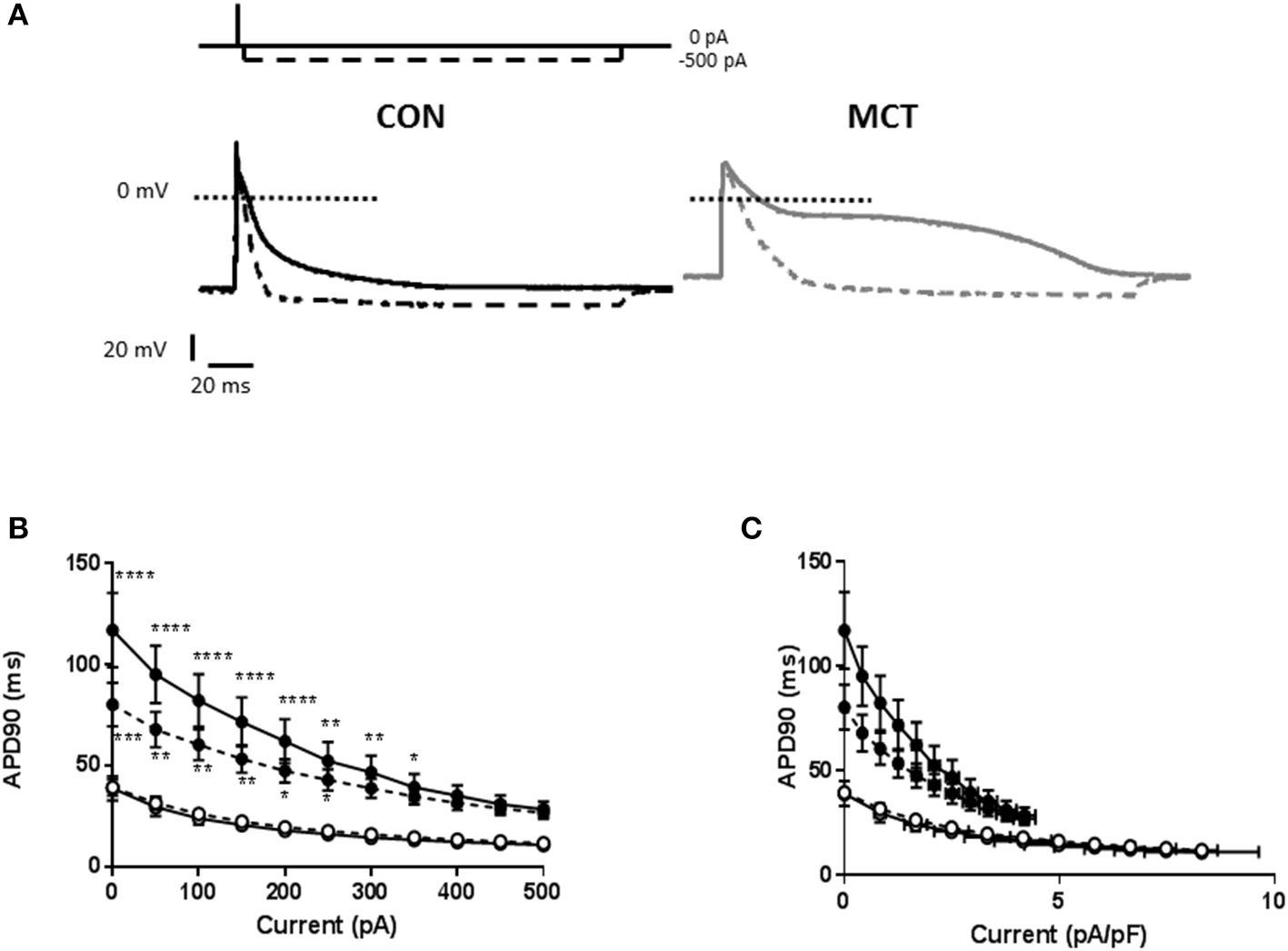 (A) Representative APs from a CON and MCT myocyte. When a 150 ms, −500 pA hyperpolarizing pulse was applied shortly after the AP upstroke, the APD was shortened (dashed line). The shortening was greater in the MCT myocyte. (B) APD90 in CON (°) and MCT (•) myocytes in the presence of hyperpolarizing pulses from 0 to −500 pA at 1 and 5 Hz (dashed lines). The shortening effect of a given current amplitude was greater in MCT myocytes than CON. Increasing stimulation frequency attenuated the shortening in MCT myocytes but had no effect in CON myocytes. (C) A similar profile of APD shortening to that described in (B) was observed when hyperpolarizing current was normalized to cell capacitance. n = 6 CON and 7 MCT myocytes ****P < 0.0001, ***P < 0.001, **P < 0.01, *P < 0.05 CON vs. MCT at the same stimulation frequency two way RM ANOVA.