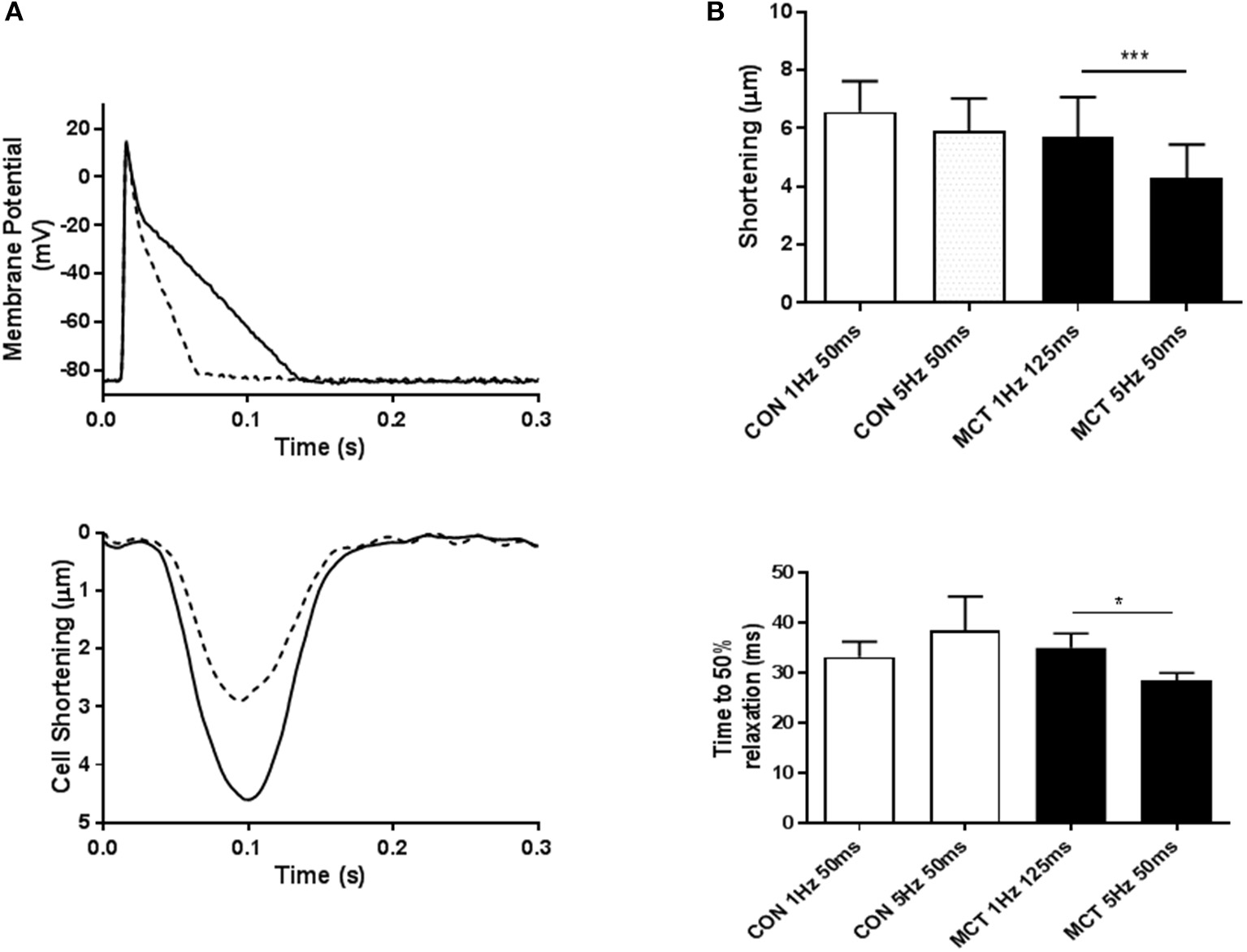 (A) When the voltage clamp profile was changed from mimicking a long to a short (dashed line) AP, the associated cell shortening (dashed line) decreased, demonstrating that AP profile can influence contraction. (B) Cell shortening and time to 50% relaxation in response to voltage clamp protocols mimicking APD restitution. For CON myocytes depolarization duration was 50 ms at both 1 and 5 Hz, for MCT myocytes depolarization was 125 ms at 1 Hz and 50 ms at 5 Hz. Increasing stimulation frequency had no effect on the amplitude or time course of contraction in CON myocytes but reduced both in MCT myocytes. Thus, mimicking APD restitution in MCT myocytes provoked mechanical restitution. n = 11 CON and 11 MCT myocytes. *P < 0.05, ***P < 0.001, paired t-test 1 vs. 5 Hz for CON and MCT.