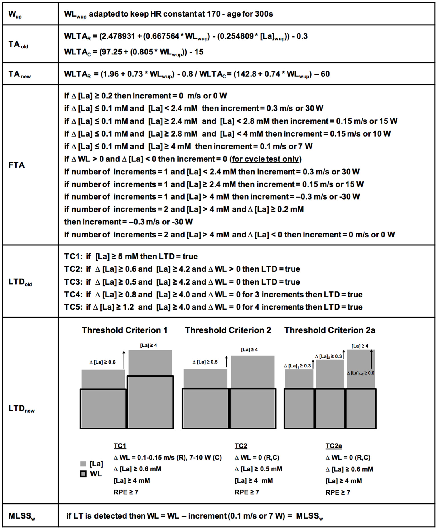Detailed ILT-Test algorithms. The warm-up (Wup) workload (WL) was kept constant automatically. The initially used threshold adaptation (TAold) algorithm (for determination of the first workload increment after the Wup), has been continuously developed into the currently used threshold adaptation algorithm (TAnew). The fine threshold adjustment (FTA) was depending on the number of steps and the lactate concentration after every step. Note the specific criteria for ILT-Tests on the bicycle ergometer for the FTA. The first identified threshold criteria (TCs) for determination of the lactate threshold (LTDold), were constantly verified and developed into the actual TCs 1, 2, and 2a (LTDnew). After lactate threshold (LT) detection, the arterial lactate concentration [LA] increase stopped after a slight workload reduction. HR, heart rate; MLSSW, maximal lactate steady state workload; RPE, rating of perceived exertion; WLTAR, workload threshold adaptation running; WLTAc, workload threshold adaptation cycling.