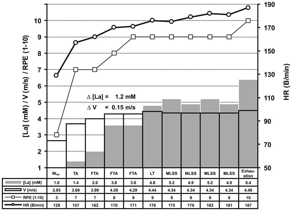 We examined the consequences of slight workload variations at the MLSSW on lactate kinetics in 426 treadmill and bicycle ergometer tests. Within this WL range, increments of 0.1–0.15 m/s on the treadmill or 7–10 W on the bicycle ergometer caused a steep increase of [La] between 0.5 and 2.4 mM indicating LT achievement. The rapid increase of [La] occurred from one to eight 4 min-increments after the initial workload change. In addition to proving that the LT and the MLSSW occur in a narrow WL range, we showed that peripheral arterial blood collection is sufficiently precise for assessing lactate kinetics in response to repeated, minimal WL modifications.