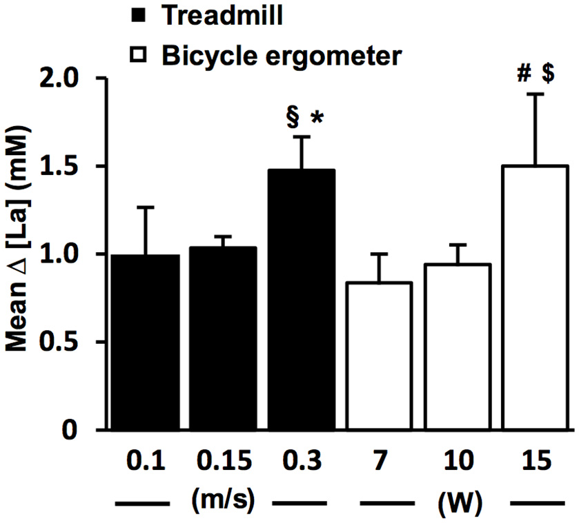 The lactate increase is augmented with higher increments at the individual lactate threshold. Relationship between workload (WL) increment (ΔV, ΔP) and arterial lactate increase (Δ [La]) at the lactate threshold (LT) detected with threshold criterion 1 (TC1) on the treadmill (n = 169, black bars) and bicycle ergometer (n = 69, white bars). The [LA] increase starts to appear after a slight workload increment of 0.1–0.15 m/s in running and 7–10 W in cycling, and gets more pronounced with higher workload increments. §P = 0.02 vs. 0.15 m/s (two-tailed unpaired t-test); *P < 0.001 vs. 0.15 m/s (Mann-Whitney-U-Test); #P = 0.002 vs. 7 W (Mann-Whitney-U-Test); $P < 0.001 vs. 10 W (two-tailed unpaired t-test). Data are expressed as means ± SE.