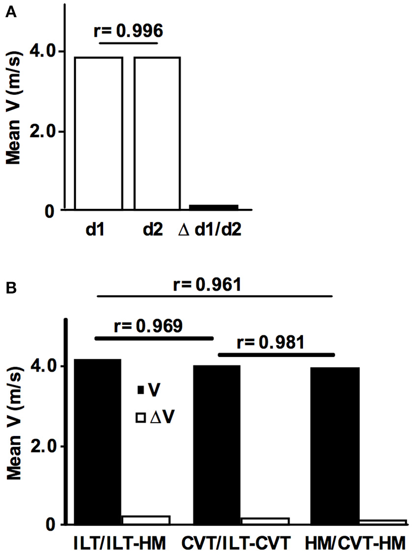 To examine the reproducibility of the ILT-Test, 17 subjects repeated the protocol after an adequate period of recovery (Figure 4A). The mean day-to-day difference of the running velocity at the MLSSW during the ILT-Test was 0.07 m/s, and a significant positive correlation was found between treadmill velocities at test day 1 and 2 (r = 0.996, P < 0.001, Figure 4A). Therefore, the mean day-to-day difference was below the workload increments of 0.1–0.15 m/s used in the ILT-Test on the treadmill, suggesting a high reproducibility of the MLSSW.