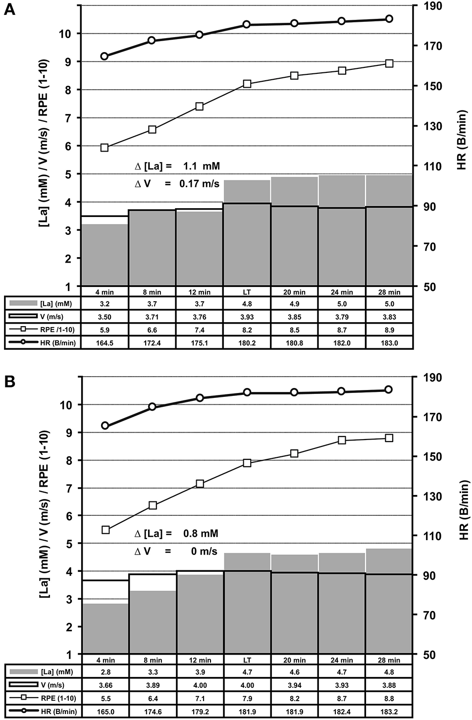 Summary of treadmill ILT-Tests which met threshold criterion 1 (A, n = 169) or 2 (B, n = 109). Group mean values are shown for arterial lactate concentration (mM) [La], velocity (m/s), heart rate (B/min) and RPE (1–10). Note the steep [La] increase at the lactate threshold (LT) in response to a slight increase of treadmill velocity. (A) Threshold criterion 1, Δ [La] = 1.1 ± 0.44 mM, Δ V = 0.17 ± 0.06 m/s; (B) Threshold criterion 2, Δ [La] = 0.8 ± 0.36 mM. HR, heart rate; RPE, rating of perceived exertion; V, treadmill velocity.