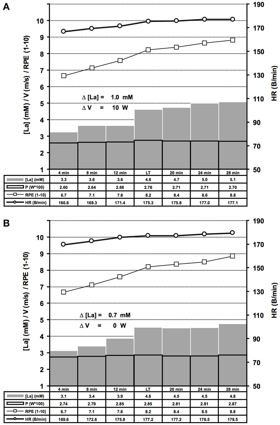 Summary of bicycle ergometer ILT-Tests which met threshold criterion 1 (A, n = 69) or 2 (B, n = 79). Group mean values are shown for arterial lactate concentration [La] (mM), velocity (m/s), heart rate (B/min) and RPE (1–10). Note the steep [La] increase at the lactate threshold (LT) in response to a slight increase of cycling power. (A) Threshold criterion 1, Δ [La] = 1.0 ± 0.48 mM, Δ W = 10 ± 1.58 W; (B) Threshold criterion 2, Δ [La] = 0.7 ± 0.29 mM. V, treadmill velocity.