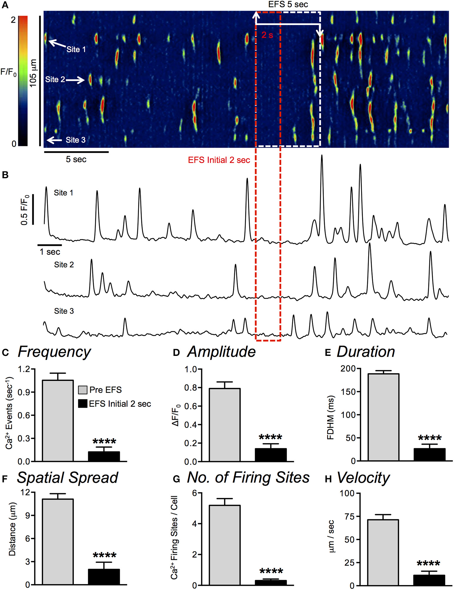 Ca2+ transients in ICC-DMP are inhibited after initiation of nerve stimulation. (A) Representative ST map of Ca2+ transients in a single ICC-DMP taken from a recording in situ (60x objective). A color-coded overlay and calibration scale was imported to depict fluorescence intensity (F/F0) and enhance visualization of Ca2+ sites. Low fluorescence areas are indicated in dark blue or black. High intensity fluorescence areas are indicated in red and orange. EFS (10 Hz, for 5 s) was applied, as indicated by the white dashed box. The red dashed box highlights the initial 2 s of EFS. The white arrows near the beginning of the ST map indicate 3 specific Ca2+ firing sites and their firing activity is plotted in the traces shown in (B). (C–H) Summary data quantifying the effects of nerve evoked responses on ICC-DMP Ca2+ transient frequency (C), amplitude (D), duration (E), spatial spread (F), number of Ca2+ firing sites (G) and Ca2+ transient velocity (H) during the initial 2 s of EFS (n = 19, c = 48). All statistical analyses are in comparison to the pre-EFS period. ****P < 0.0001.