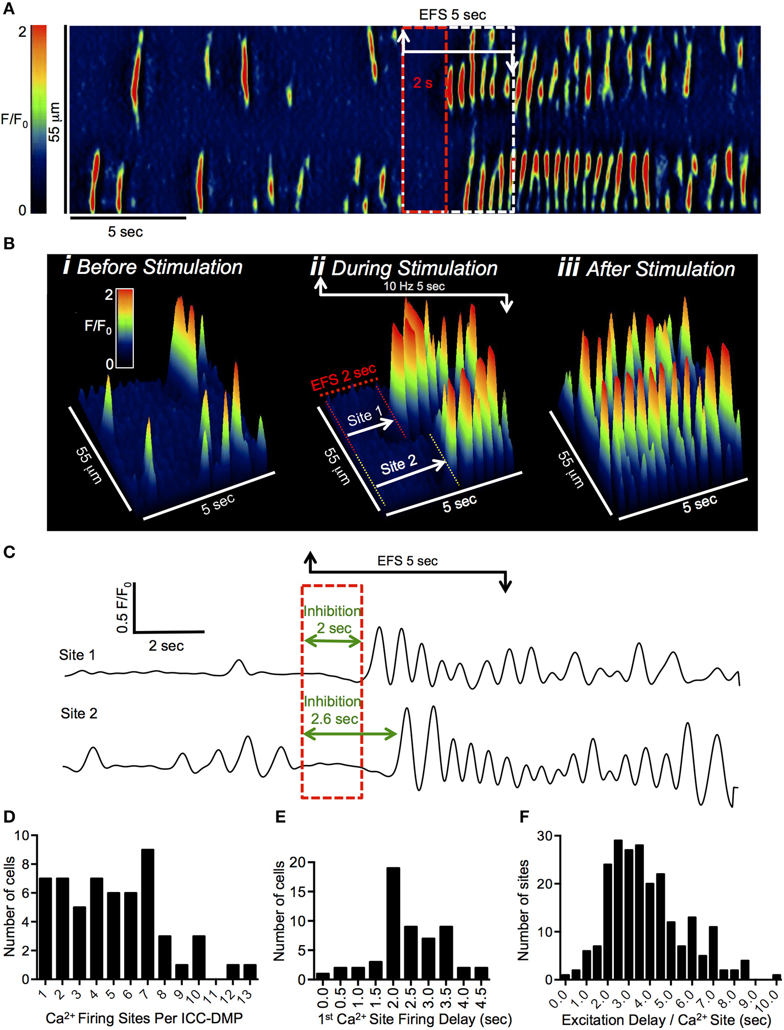 Escape from EFS inhibition occurs at variable times at diferent Ca2+ firing sites in ICC-DMP. (A) Representative ST map of Ca2+ transients in a single ICC-DMP in situ. The period of EFS (10 Hz; 5 s) is indicated by the white dashed box, and the red dashed box highlights the initial 2 s of EFS. (B) 3-D plots illustrating Ca2+ transient firing in the ICC-DMP shown in (A) in the 5 s pre-EFS (i), during EFS (ii), and post-EFS (iii). The white arrows in (Bii) highlight 2 distinct firing sites, which were inhibited during the initial phase of EFS and then escaped inhibition at different times. The durations of inhibition at site 1 and 2 are highlighted by the red and yellow dashed lines, respectively, and the activities of the 2 sites are plotted in (C). The initial 2 s of EFS is indicated by the red dashed box and green lines indicate different inhibition times for each site. (D) Summary histogram showing the number of Ca2+ firing sites contained in ICC-DMP (n = 19, c = 48). (E) Summary histogram showing the timing of the first Ca2+ firing site in ICC-DMP to escape from inhibition during EFS (n = 19, c = 48). (F) Summary histogram showing the times at which all Ca2+ firing sites in ICC-DMP escaped from inhibition during EFS (n = 19, c = 48).