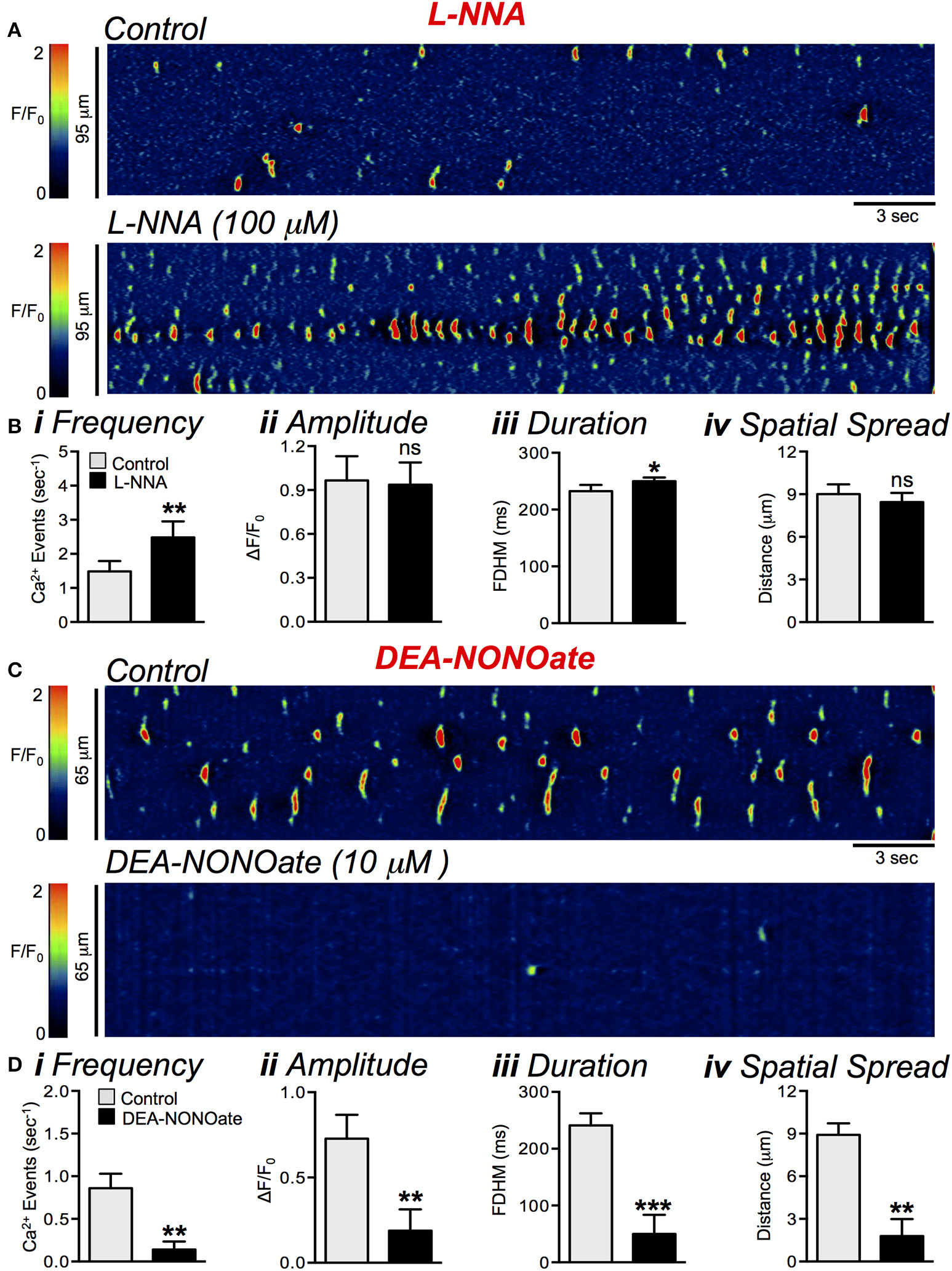 The nitric oxide synthase (NOS) inhibitor Nω-Nitro-L-arginine (L-NNA, 100 μM) incubated for 15 min, increased the firing frequency of Ca2+ transients in ICC-DMP from 1.5 ± 0.3 s−1 in control to 2.5 ± 0.5 s−1, as shown in Figures 4A,Bi (P = 0.0042, n = 5, c = 11). The duration of Ca2+ transients was also increased by L-NNA from 232 ± 11 to 250 ± 6.5 ms (Figure 4Biii, P = 0.04, n = 5, c = 11). However, neither the amplitude (Figure 4Bii, P = 0.62, n = 5, c = 11) nor the spatial spread (Figure 4Biv, P = 0.35, n = 5, c = 11) of Ca2+ transients was affected significantly by L-NNA.