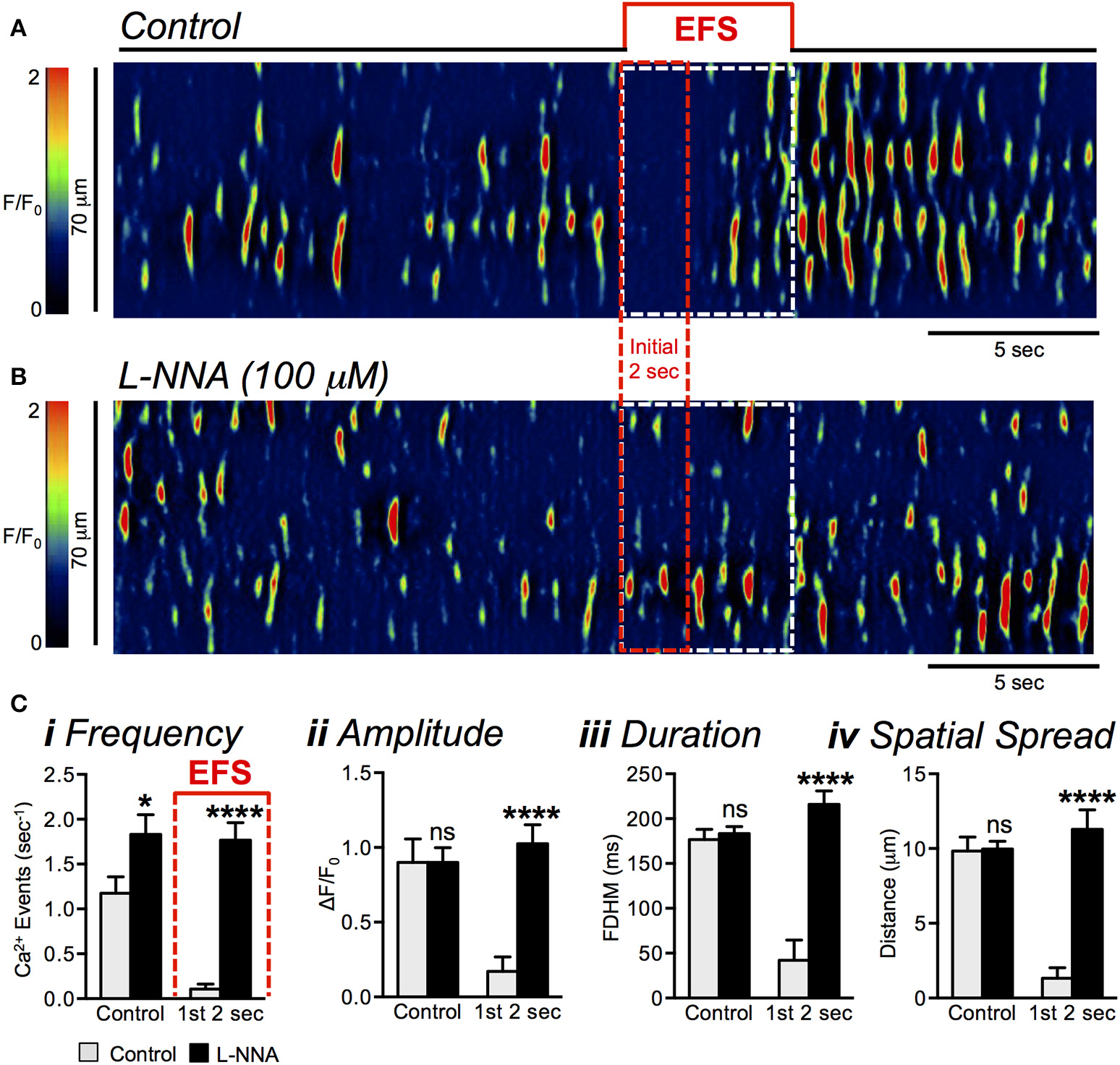 As above, EFS evoked inhibition of Ca2+ transients for about ~2 s after the onset of stimulation (Figure 5A). L-NNA (100 μM) blocked the initial inhibitory period, and Ca2+ transients persisted during the initial 2 s of EFS (Figure 5B). The firing frequency of Ca2+ transients during the first 2 s of EFS in control conditions was 0.1 ± 0.06 s−1, and this increased to 1.8 ± 0.2 s−1 in the presence of L-NNA (Figure 5Ci, P < 0.0001, n = 5, c = 15). L-NNA also increased the amplitude of Ca2+ transients from 0.2 ± 0.1 ΔF/F0 to 1 ± 0.1 ΔF/F0 (Figure 5Cii, P < 0.0001, n = 5, c = 15), the duration from 42 ± 14 ms to 216 ± 14.9 ms (Figure 5Ciii, P < 0.0001, n = 5, c = 15), and the spatial spread from 1.3 ± 0.7 μm to 11.3 ± 1.3 μm (Figure 5Civ, P < 0.0001, n = 5, c = 15).
