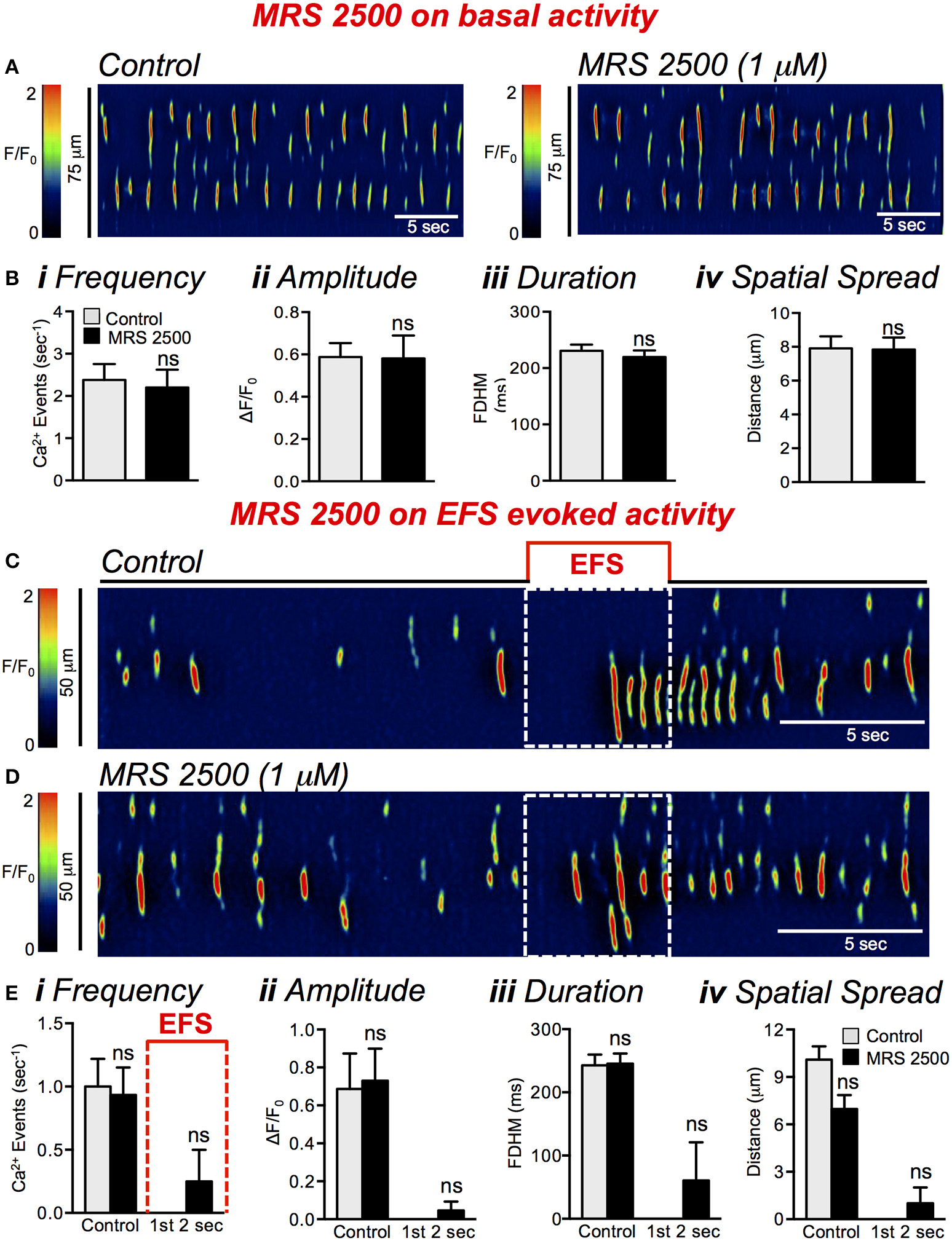 The effect of MRS 2500 on basal activity and EFS-evoked inhibitory effects on Ca2+ responses. (A) Representative ST map showing lack of effects of MRS 2500 (1 μM) on basal Ca2+ transients in ICC-DMP. (B) Summary data showing the effects of MRS 2500 (1 μM) on basal Ca2+ transient activity in ICC-DMP. Neither frequency (i), amplitude (ii), duration (iii), or spatial spread (iv) were affected by MRS2500 (n = 5; c = 10; ns = P > 0.05). (C,D) Representative ST maps showing the effects of MRS 2500 (1 μM) on Ca2+ transients during EFS (10 Hz for 5 s; indicated by the red line and dotted white box in ST maps). (E) Summary data showing the lack of effects of MRS 2500 (1 μM) on the inhibition of Ca2+ transients during the first 2 s of EFS: frequency (i), amplitude (ii), duration (iii), and spatial spread (iv) in ICC-DMP during control conditions (pre-EFS), and within the first 2 s of sustained EFS (n = 5, c = 6). ns = P > 0.05.