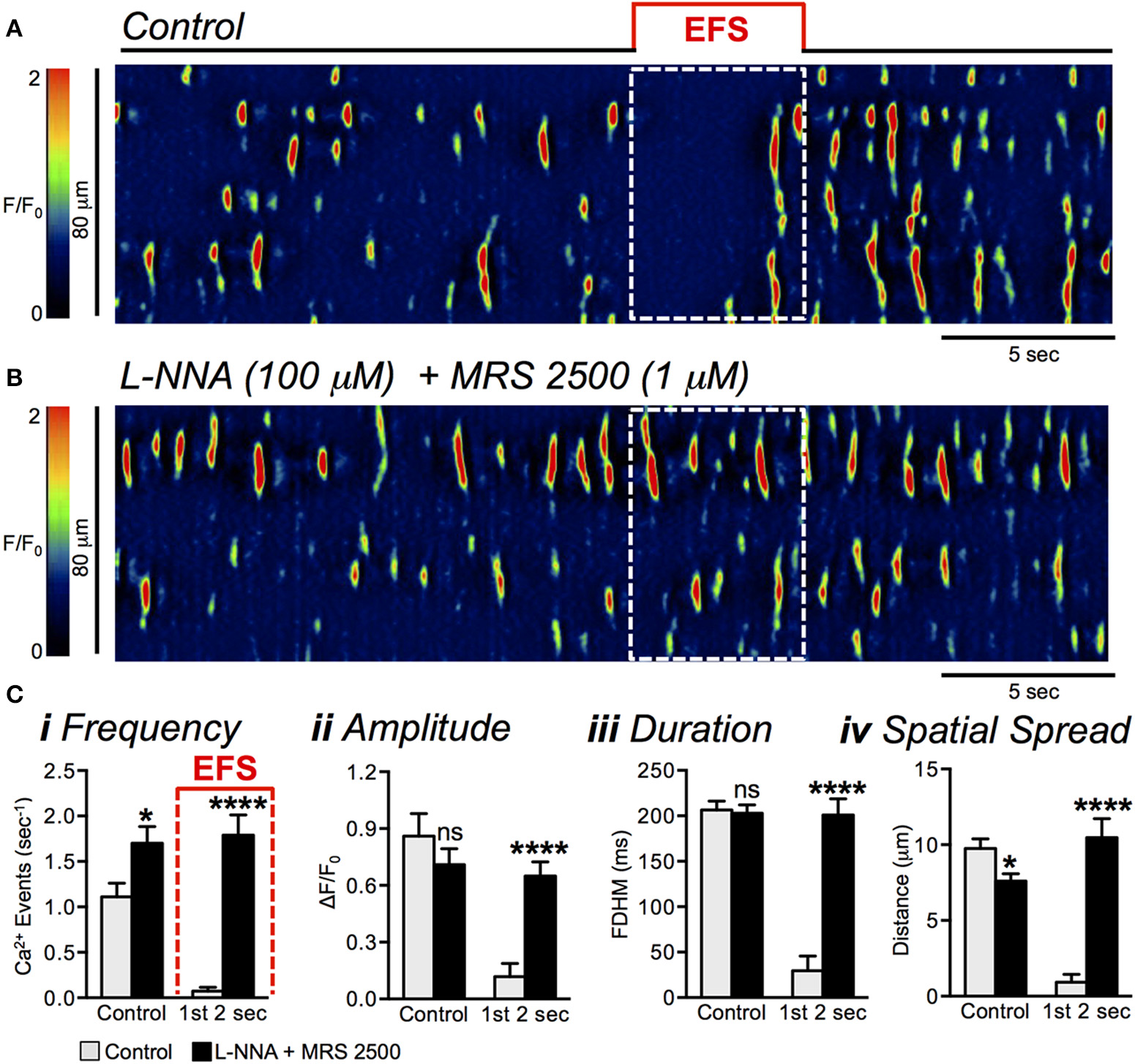 Effects of combining L-NNA + MRS 2500 on EFS-evoked inhibitory Ca2+ responses in ICC-DMP. (A,B) Representative ST maps of ICC-DMP showing inhibition of Ca2+ transients initially during sustained EFS (A); EFS at 10 Hz for 5 s; indicated by the solid red line and dotted white box in ST maps) and the blockade of EFS evoked inhibition in response to a combination of L-NNA (100 μM) and MRS 2500 (1 μM; B). (C) Summary data showing the blockade of EFS evoked inhibitory effects by L-NNA (100 μM) + MRS 2500 (1 μM) on Ca2+ transient frequency (i), amplitude (ii), duration (iii), and spatial spread (iv) in ICC-DMP during control conditions (pre-EFS), and in the 1st 2 s of EFS (n = 9, c = 26). ns = P > 0.05, *P < 0.05, ****P < 0.0001.