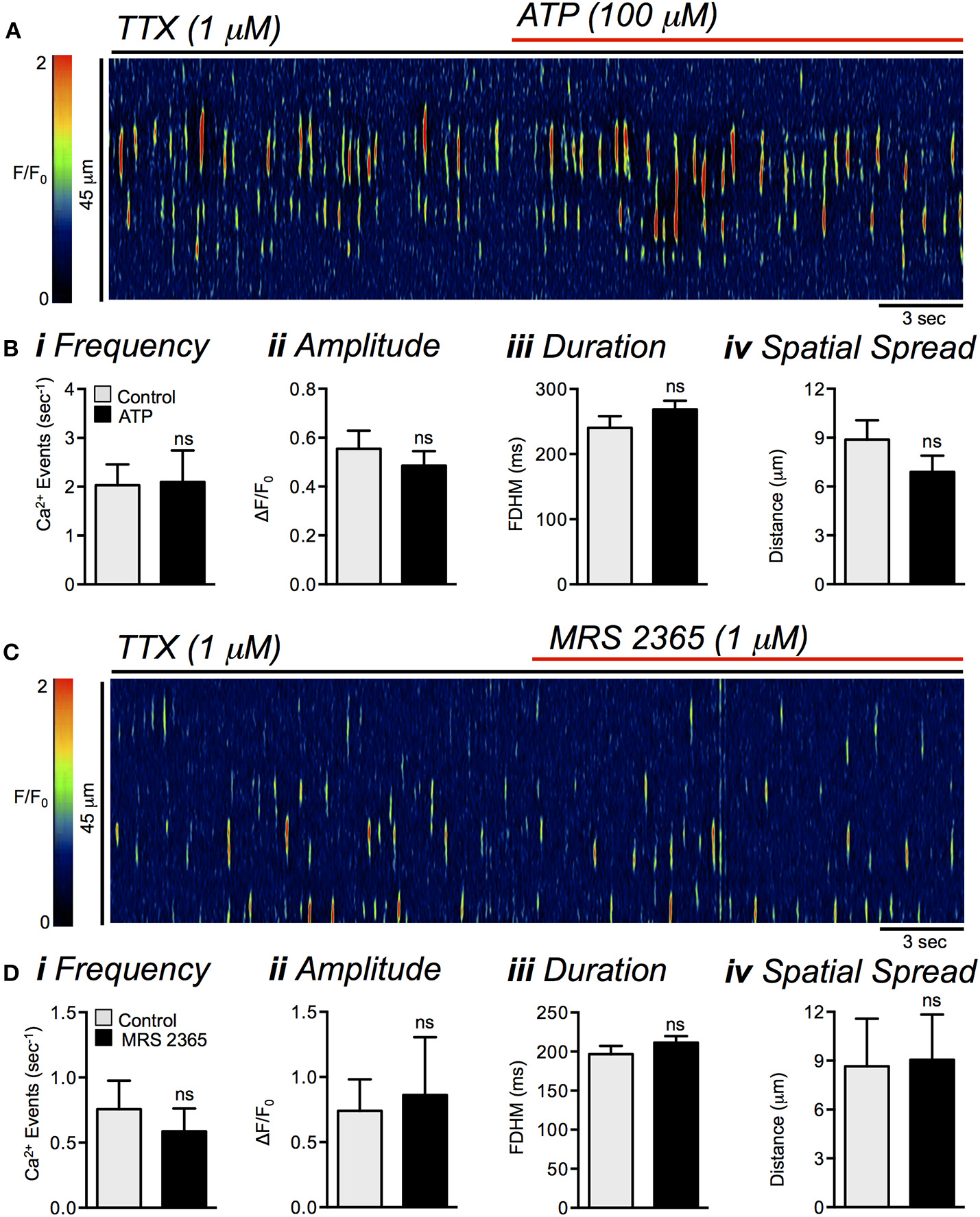 Lack of effects of purinergic agonists on Ca2+ transients in ICC-DMP. (A) Representative ST map showing lack of effects of ATP (100 μM) on Ca2+ transients in ICC-DMP in the presence of TTX (1 μM). (B) Summary bar graphs showing the lack of effects of ATP (100 μM) on the frequency (i), amplitude (ii), duration (iii), and spatial spread (iv) of Ca2+ transients in ICC-DMP in the presence of TTX (n = 3, c = 6). ns = P > 0.05. (C) Representative ST maps showing the lack of effects of P2Y1 receptor agonist MRS 2365 (1 μM) on Ca2+ transients in ICC-DMP in the presence of TTX. (D) Summary bar graphs showing lack of the effects of MRS 2365 (1 μM) on the frequency (i), amplitude (ii), duration (iii), and spatial spread (iv) of Ca2+ transients in ICC-DMP in the presence of TTX (n = 3, c = 5). ns = P > 0.05.