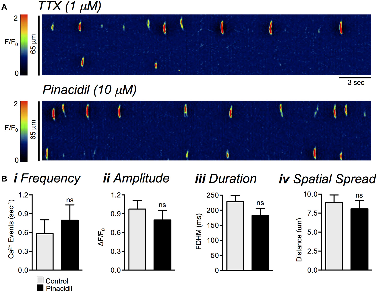 The effects of pinacidil on Ca2+ transients in ICC-DMP. (A) Representative ST maps showing the effects of pinacidil (10 μM) on Ca2+ transients in ICC-DMP in the presence of TTX (1 μM). (B) Summary bar graphs showing the effects of pinacidil (10 μM) on the frequency (i), amplitude (ii), duration (iii), and spatial spread (iv) of Ca2+ transients in ICC-DMP in the presence of TTX (n = 4, c = 16). ns = P > 0.05.