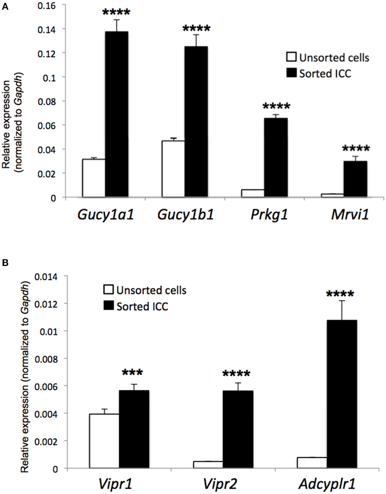 Expression of genes encoding nitrergic and peptidergic signaling molecules in ICC. (A) Quantitative PCR (qPCR) data showing the relative expression of transcripts for Gucy1a1 and Gucy1b1, protein kinase cGMP-dependent type 1: Prkg1, and inositol-1,4,5 triphosphate receptor I-associated G kinase substrate (IRAG; Mrvi1) in sorted small intestinal ICC by FACS and unsorted cells (total cell population). qPCR data is expressed as relative expression, normalized to Gapdh, n = 4. (B) qPCR data showing the relative expression of transcripts for Vipr1 and Vipr2 (VIP receptors) and Adcyplr1 (PACAP receptor) in FACS sorted small intestinal ICC and unsorted cells (total cell population). qPCR data is expressed as relative expression, normalized to Gapdh, n = 4.