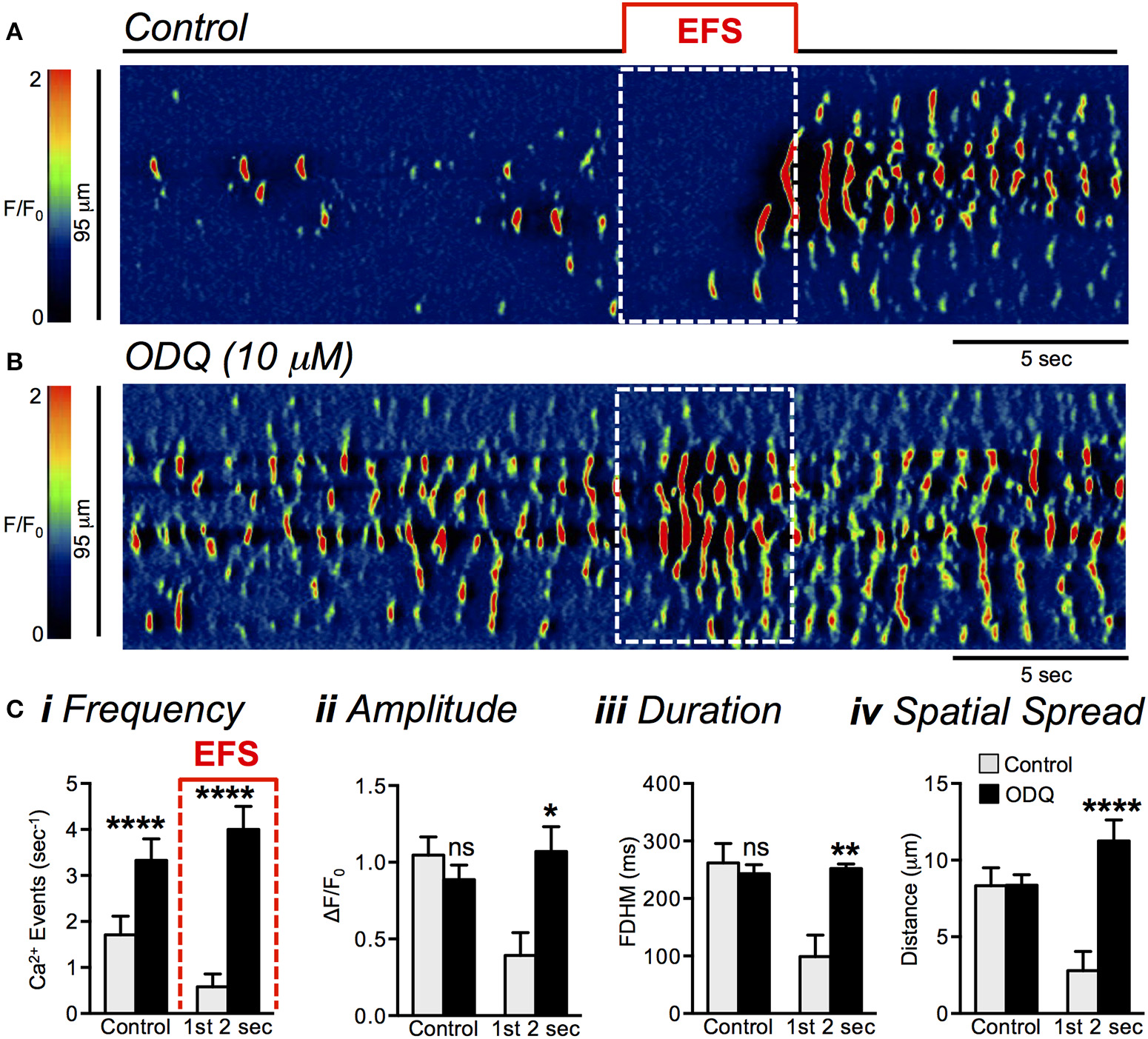ODQ (10 μM) also blocked the inhibitory effects of EFS on ICC-DMP during the initial 2 s of stimulation (Figures 12A–C). In these experiments the frequency of Ca2+ transients during the first 2 s of EFS was 0.6 ± 0.3 s−1 in control and increased to 4 ± 0.5 s−1 in the presence of ODQ (Figure 12Ci, P < 0.0001, n = 5, c = 25). ODQ also increased Ca2+ transient amplitude during EFS from 0.4 ± 0.15 ΔF/F0 to 1.1 ± 0.2 ΔF/F0 (Figure 12Cii, P = 0.02, n = 5, c = 25), duration from 99 ± 37.2 ms to 252 ± 7.8 ms (Figure 12Ciii, P = 0.003, n = 5, c = 25), and spatial spread from 2.8 ± 1.3 μm to 11.3 ± 1.4 μm (Figure 12Civ, P < 0.0001, n = 5, c = 25).