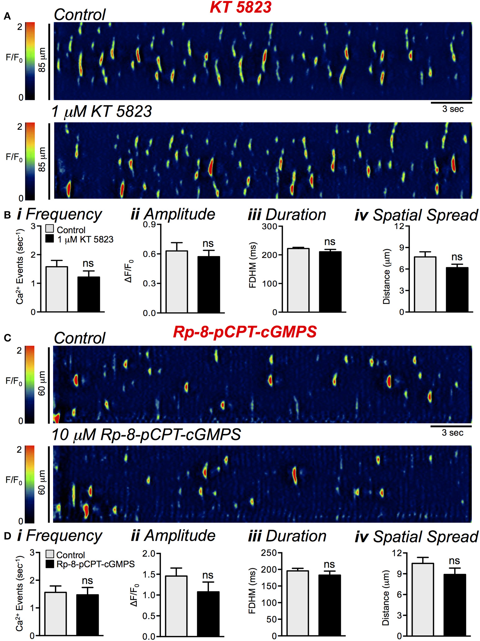 PKG inhibitors had no effect on basal Ca2+ transients in ICC-DMP. (A) Representative ST maps showing the effect of KT 5823 (1 μM) on Ca2+ spontaneous transients in ICC-DMP. (B) Summary graphs showing the lack of effect of KT 5823 on the frequency (i), amplitude (ii), duration (iii), and spatial spread (iv) of basal Ca2+ transients in ICC-DMP (n = 4, c = 11). (C) Representative ST maps showing the lack of effect of Rp-8-pCPT-cGMPS (10 μM) on basal Ca2+ transients in ICC-DMP. (D) Summary graphs showing the lack of effect of Rp-8-pCPT-cGMPS on the frequency (i), amplitude (ii), duration (iii), and spatial spread (iv) of Ca2+ transients in ICC-DMP (n = 8, c = 21). ns = P > 0.05.