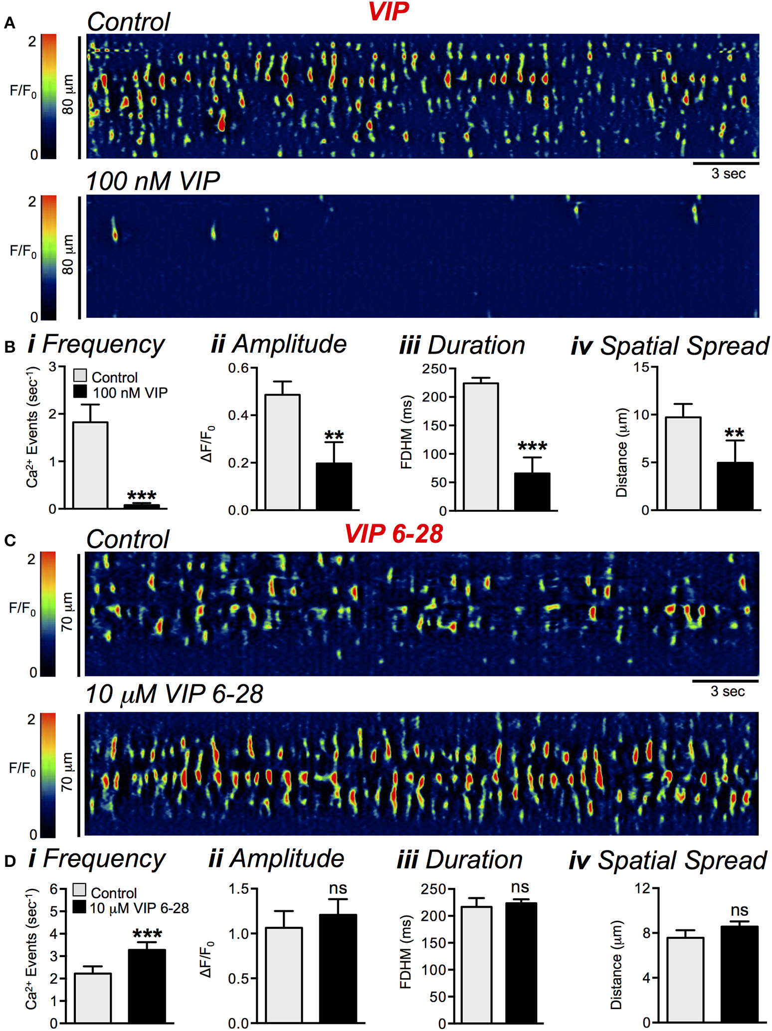 VIP modulation of spontaneous ICC-DMP Ca2+ transients. (A) Representative ST maps showing the effects of VIP (100 nM) on Ca2+ transients in ICC-DMP. (B) Summary graphs showing the effect of VIP on the frequency (i), amplitude (ii), duration (iii), and spatial spread (iv) of Ca2+ transients in ICC-DMP (n = 5, c = 12). (C) Representative ST maps showing the effect of VIP 6-28 (10 μM) on basal Ca2+ transients in ICC-DMP. (D) Summary graphs showing the effect of VIP 6–28 on the frequency (i), amplitude (ii), duration (iii), and spatial spread (iv) of Ca2+ transients in ICC-DMP (n = 5, c = 23). ns = P > 0.05, **P < 0.01, ***P < 0.001.