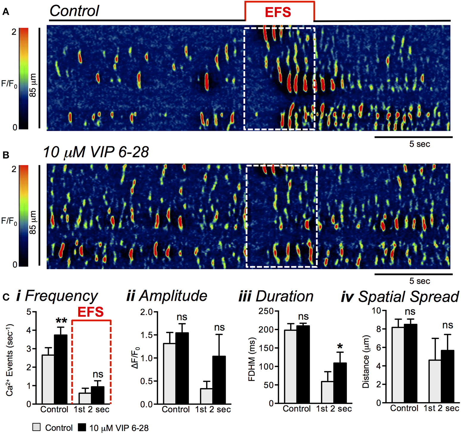 We also tested the effects of VIP sensitive inputs to ICC-DMP. As shown in Figure 14, application of VIP (100 nM) led to inhibition of Ca2+ transient firing in ICC-DMP (Figure 14A). VIP reduced the firing frequency of Ca2+ transients from 1.8 ± 0.4 s−1 in control to 0.08 ± 0.04 s−1 (Figure 14Bi, P = 0.0004, n = 5, c = 12). Similarly, the amplitude of Ca2+ transients was reduced from 0.5 ± 0.06 ΔF/F0 to 0.2 ± 0.08 ΔF/F0 by VIP (Figure 14Bii, P = 0.006, n = 5, c = 12). The duration of Ca2+ transients was decreased from 224 ± 9.8 ms to 66 ± 28 ms by VIP (Figure 14Biii, P = 0.0001, n = 5, c = 12). Finally, VIP also significantly decreased the spatial spread of Ca2+ transients from 9.7 ± 1.4 μm to 5 ± 2.3 μm (Figure 14Biv, P = 0.003, n = 5, c = 12). VIP 6-28 (10 μM) caused a significant increase in basal Ca2+ transient firing in a similar manner to blocking nitrergic input with application of L-NNA (Figure 14C). VIP 6-28 increased basal Ca2+ transient firing from 2.2 ± 0.3 to 3.3 ± 0.3 s−1 (Figure 14Di, P = 0.0007, n = 5, c = 23). The amplitude (P = 0.38), duration (P = 0.67) and spatial spread (P = 0.24) of Ca2+ transients was not significantly affected by VIP 6-28, n = 5, c = 23 (Figure 14D).