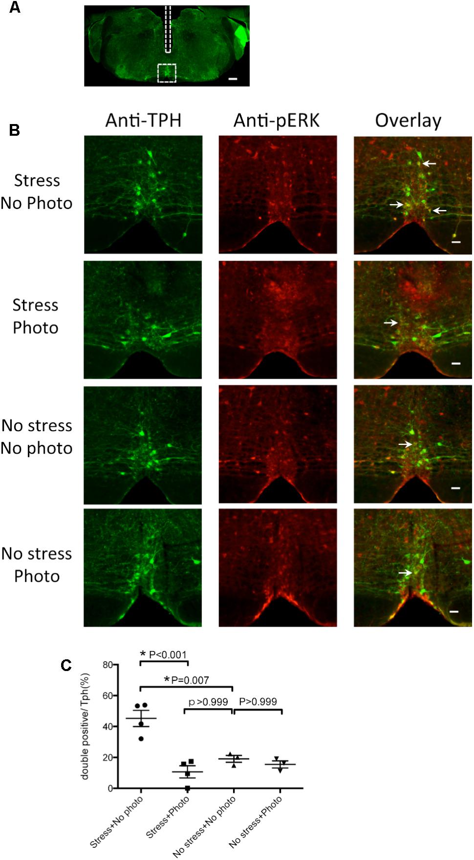 It may be of note that the number of pERK positive and TPH negative cells (non-serotonergic active neurons) was not different among the groups (10 ± 4, 4 ± 2, 15 ± 1, and 20 ± 8, respectively, for Stress + No Photo, Stress + Photo, No Stress + No Photo, and No Stress + Photo groups), indicating photo-illumination did not affect the activity of non-serotonergic neurons.
