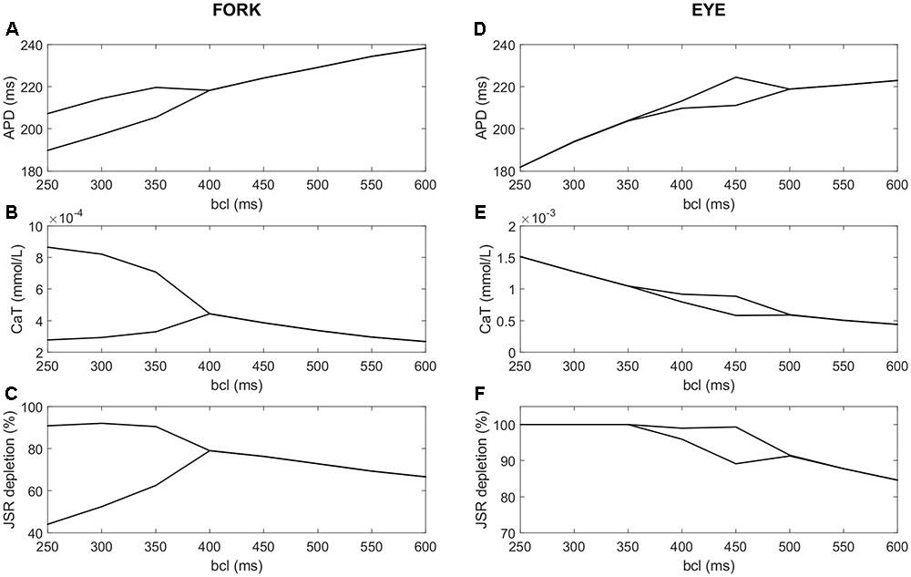, where min(CaJSR) is the minimum JSR contents per action potential and CaJSR, start is the starting JSR calcium concentration in the same action potential. In panels (D–F) are respectively shown APD, CaT, and depletion in eye-type alternans. All plots show the values of the two last action potentials for every bcl and variable of interest; bifurcation indicates that the last two action potentials differ in the variable of interest, manifesting alternans.