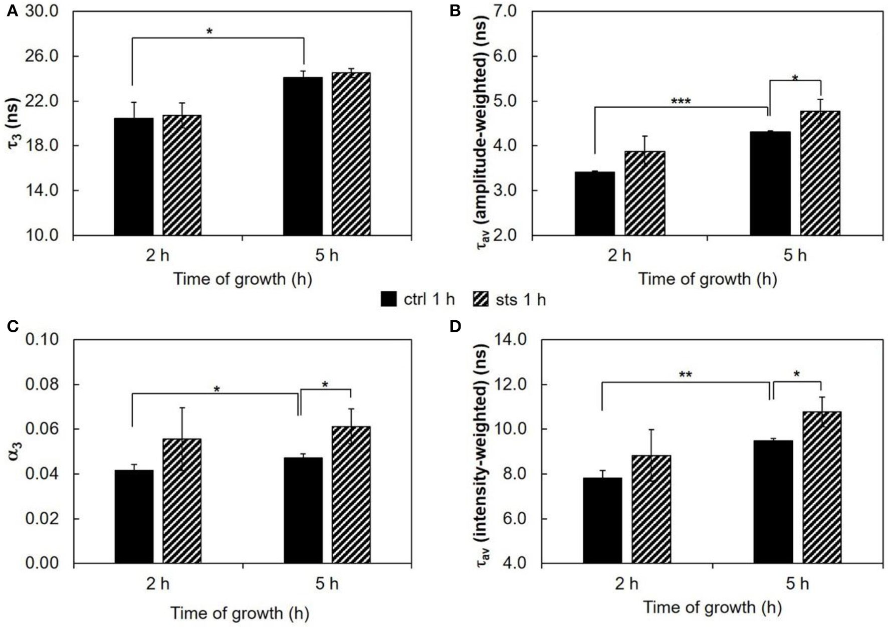 Time-resolved fluorescence spectroscopic parameters of t-PnA in the plasma membrane of N. crassa conidia. (A) The long lifetime component, τ3, (B) amplitude-weighted mean fluorescence lifetime, τav (amplitude-weighted), (C) normalized amplitude of the long component, α3, and (D) intensity-weighted mean fluorescence lifetime, τav (intensity-weighted), of t-PnA were obtained from the fluorescence intensity decay of the probe at 30°C. The results present the mean ± S.D. of at least three independent experiments, n ≥ 3. *p < 0.05, **p < 0.01, ***p < 0.001.