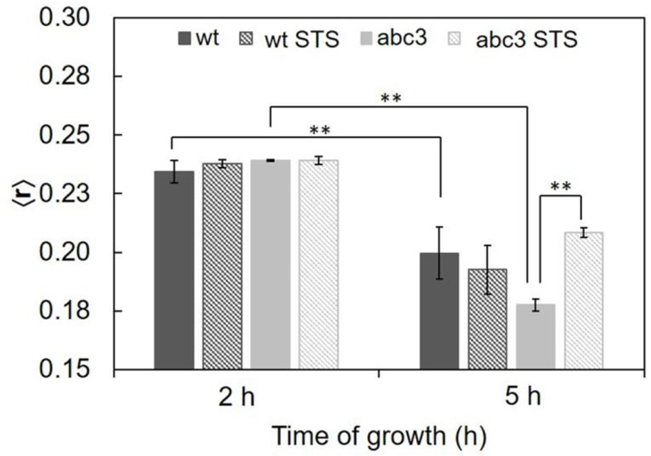 Steady-state fluorescence anisotropy of DPH in the plasma membrane of N. crassa conidia, at 30°C of the wild type (wt) or abc3 mutant, after 1 h incubation in the absence or presence of 12.5 μM STS. The values are the mean ± S.D. of at least three independent experiments, n ≥ 3. **p < 0.01.