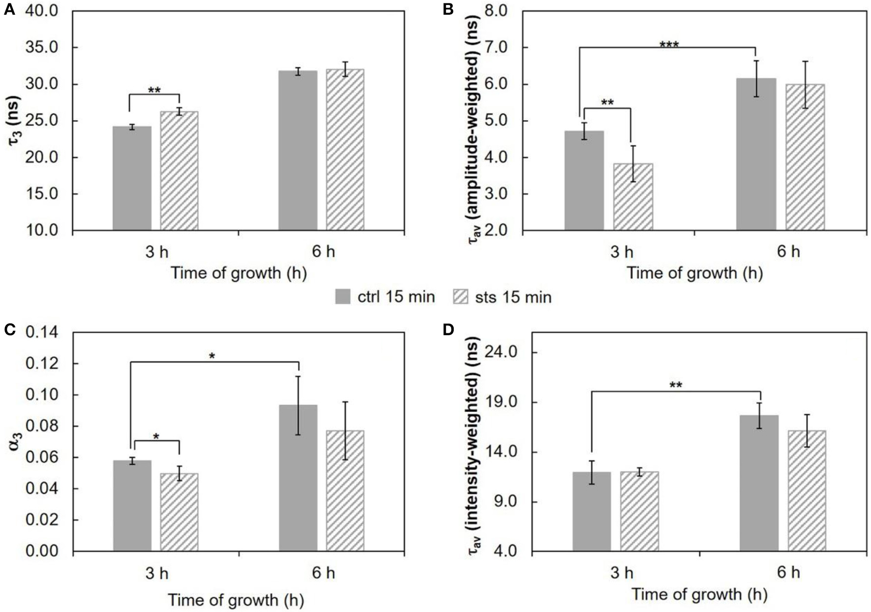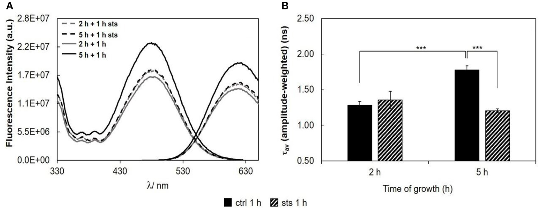 Regarding the 15 min stimulus (Figure 8), the effect of STS on the steady-state fluorescence intensity and amplitude-weighted mean fluorescence lifetime of di-4-ANEPPS is similar to the one obtained for 1 h stimulus (Figure 6), however, less pronounced at both growth times.
