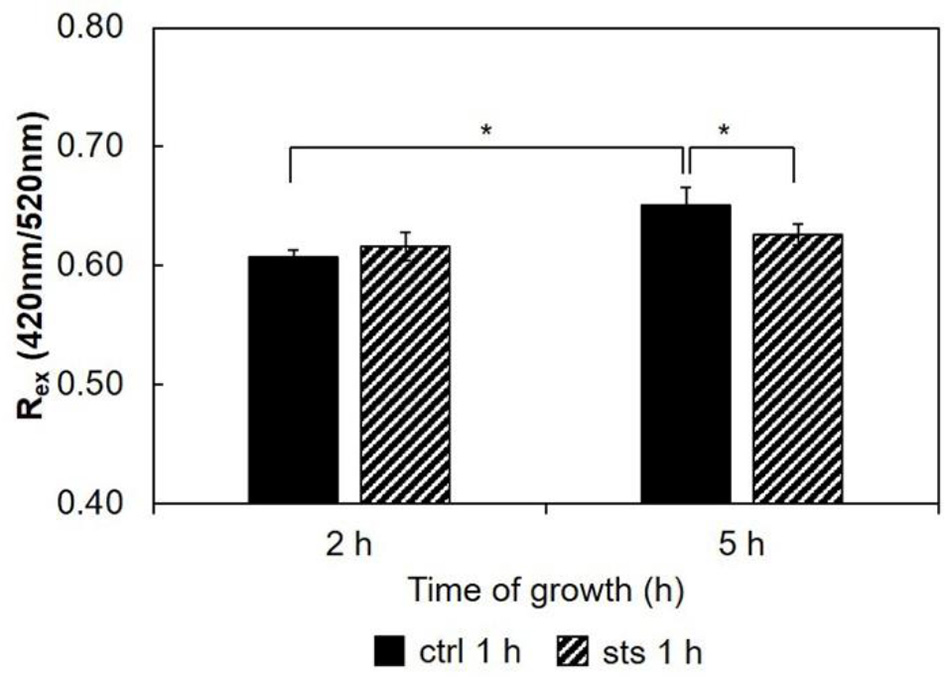 Ratio of di-4-ANEPPS fluorescence intensity produced by excitation at 420 nm to that produced by excitation at 520 nm, Rex (420 nm/520 nm) cells, at 30°C. The results present the mean ± S.D. of at least three independent experiments, n ≥ 3. *p < 0.05.