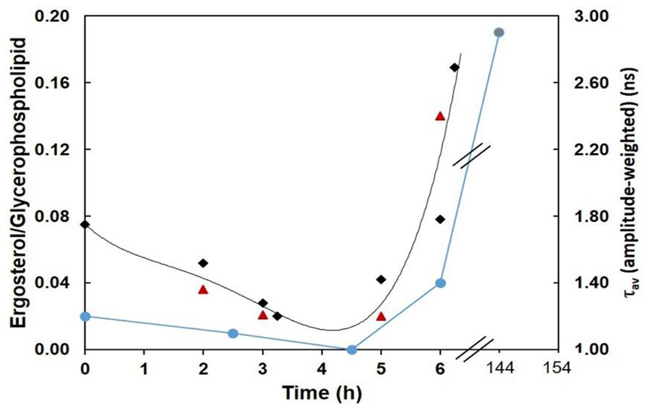To evaluate to what extent the amplitude-weighted mean fluorescence lifetime of di-4-ANEPPS is indeed related to ergosterol levels, measures of that parameter (in the absence of STS) from this and previous work (Santos et al., 2017) were plotted against total time of growth (black points) and compared with the ergosterol/glycerophospholipid ratios (blue points) (Bianchi and Turian, 1967; Kushwaha et al., 1976) (Figure 10). The overall trend of di-4-ANEPPS τav correlates remarkably with what happens for ergosterol/glycerophospholipid ratios, both of them departing from a small value that further decreases, to increase exponentially upon starting of the exponential phase. In this figure it can also be more easily observed how STS prevents the marked increase observed upon transition to the log phase of di-4-ANEPPS τav, The amplitude-weighted mean fluorescence lifetime of di-4-ANEPPS for STS treated cells (red triangles) is represented considering that growth stopped upon the addition of the drug. These points have a similar trend as the controls (black points) and are reasonably well described by the polynomial curve obtained from the fit to the controls. These effects can thus be putatively thought of as the result of a growth arrest or a slow-down in the development of the fungus. Despite the induction of a number of classical apoptotic markers, including caspase-like activity and surface binding of annexin V, in other organisms, such as Leishmania donovani, STS does not cause cell death but causes cell cycle arrest (Foucher et al., 2013). This arrest can be a direct consequence of the signaling pathways induced by STS, but might also be due to the targeting of energetic and metabolic resources for the synthesis of ABC-3 and other proteins involved in drug resistance mechanisms.