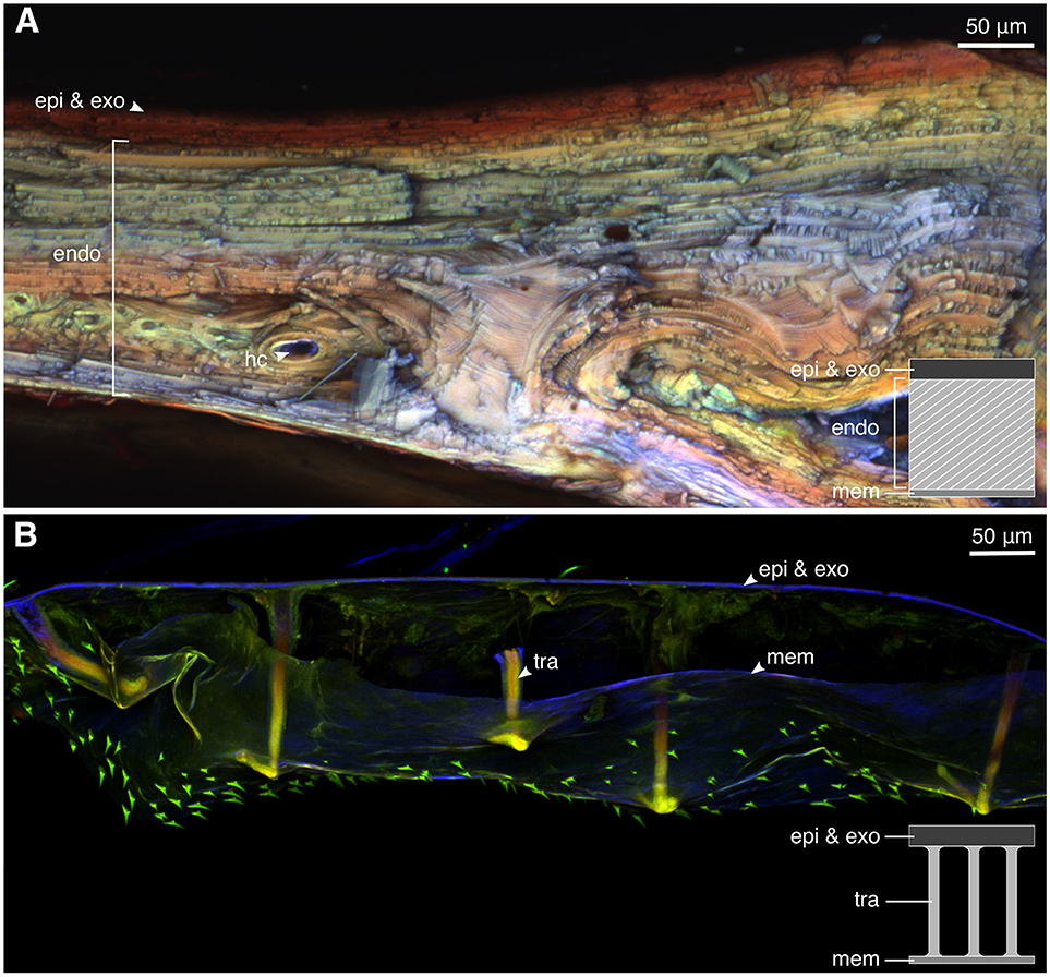 Figure 4. The material composition of the elytral cuticle of the mature and teneral Pachyrhynchus sarcitis kotoensis revealed by confocal laser scanning microscopy (CLSM). (A) Elytral cuticle of the mature weevil is thick and highly sclerotized (yellow, orange, and red). (B) Elytral cuticle of the teneral weevil is thin, resilin-dominated (blue), and contains sclerotized trabeculae (yellow) supporting the space between the cuticle and the inner membrane. (epi, epicuticle; exo, exocuticle; hc, hemolymph channels; mem, membrane; tra, trabecula).