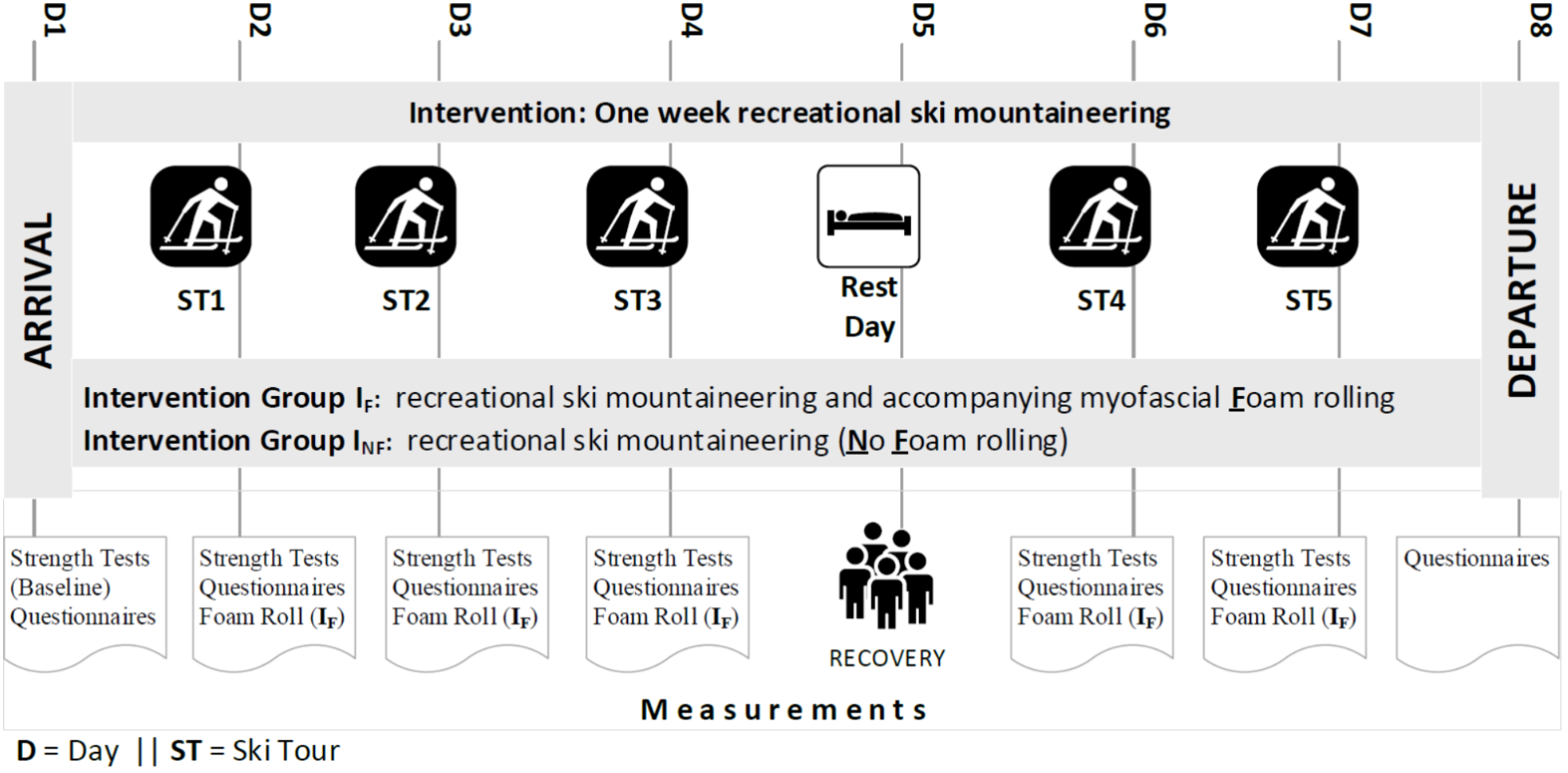 The trial took place at the ski area of the village of St. Johann (659 m above sea level), Tyrol, Austria during 2 weeks in March 2017. Participants performed five ascents and descents within 6 days, including a rest day (day 4). Baseline fluid balance and strength values were assessed on the day of arrival. Participants were subsequently assigned to matched intervention IF (Foam roll = active regeneration with myofascial foam roll) and INF (No Foam roll = no active regeneration) groups based on age, exercise capacity and muscle strength. Additionally, participants were grouped into performance categories (low, middle, high) based on their respective exercise capacity (Wattmax per kilogram body weight and maximum heart rate) after incremental maximal cycle ergometry. Groups were advised to ascend the mountains with a heart rate resembling a submaximal exercise of 70–85% of their maximal heart rate. Thus, the individual cardiopulmonary strain during ski mountaineering should be comparable among all volunteers. Furthermore, all participants were instructed about the routes and safety aspects of ski mountaineering by certified mountain guides (UIAGM). During the vacation, alcohol consumption was limited to an amount equal to one glass of beer (500 ml) per day, to avoid any negative influence on the fluid balance.