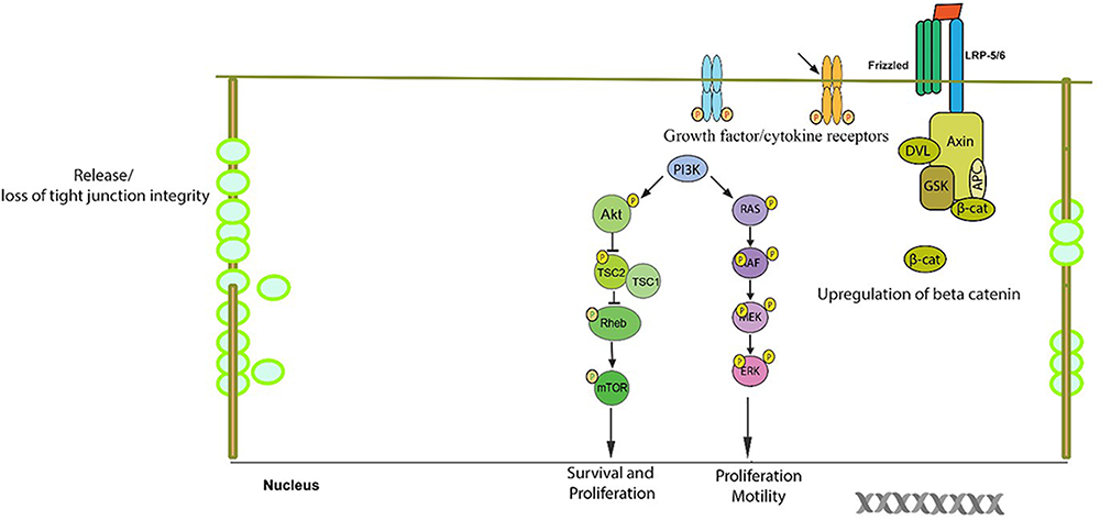 Figure 2. Schematic/proposed signaling model in a cell during tumor formation. Aberrant change in signaling pathways result in the resistance of the normal cellular apoptosis and/or senescence in a cell which is destined to be a tumor cell. The anti-apoptotic proteins belonging to the bcl2 family are upregulated. The tight junction complex changes its course of normal function of selective permeability to unrestricted flow to various unintended solutes/growth/cytokine factors which may be responsible in up regulation of survival signaling pathways. The expression and/or phosphorylation of growth factor/cytokine receptors which promote cell growth are enhanced. The PI3-K/Akt pathway, which is a survival pathway, becomes activated along with the RAS-RAF-ERK pathway and Wnt/beta-catenin pathway which result in the up regulation of several growth response genes.