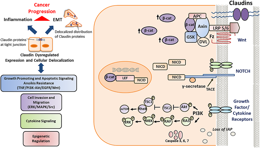 Figure 3. Schematic/proposed signaling model of role and regulation of claudins in a cell during invasive or metastatic stage. Deregulated claudin expression and delocalization occurs as a consequence of epigenetic factors, growth factors and cytokines, inducing loss of “gate and barrier” function and thereby promoting inflammation, EMT and disease progression. Once the cell is destined to be a tumor cell, it further becomes more aggressive. During this stage, the well-regulated junctional molecules between cells become more and more permissible to various factors responsible for the up regulation of the survival, rapid growth and proliferative signaling pathways. Also, the inhibitor for apoptosis (IAP) proteins, which are critical for inhibiting cancer cell death and promoting their survival, are also upregulated. Further, along with the PI3-K/Akt and RAS-RAF-ERK pathways, NOTCH pathway is also upregulated which further enhances the growth potential of the cancer cell. Further, tight junctional protein, such as claudin-1 is associated with beta-catenin and help in the enhanced translocation of beta catenin into the nucleus. At this stage both the NOTCH and the Wnt pathway act in co-ordination to enhance the metastatic potential of the cancer cell.