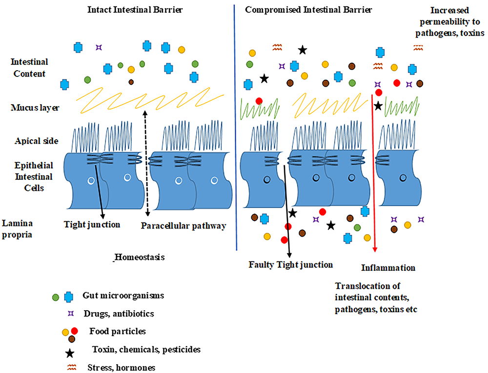 Figure 4. Schematic presentation of healthy and leaky gut. Epithelial tight junctions are intact in a healthy gut and selectively lets some molecules in and out of the intestinal epithelium by functioning as a seal between the neighboring gut cells, hence maintaining homeostasis. Factors such as proinflammatory mediators, microbial gut imbalance, infections, some foods, exposure to chemicals, toxins, or stress may disrupt epithelial tight junctions and increase the intestinal permeability, as well as possibly damage the intestinal barrier by forming tissue lesions and punctures that could lead to a leaky intestinal epithelium. This whole sequence of events may lead to the translocation of undesired luminal gut content (microorganisms, toxins, undigested food particles) into the host tissues activating an immunological response.
