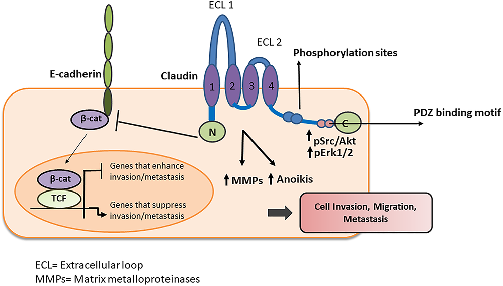 Tight junctions of both epithelial and endothelial cells are critical in regulating the permeability across the epithelia and the TJ complex is a hub for signaling pathways which governs the metastatic potential in several cancers. The role of claudins in TJ cancer signaling hasbeen well documented (Figures 2, 3, 4). Mitogen-activated protein kinase (MAPK) (Fujibe et al., 2004) or protein kinase C (PKC) (Nunbhakdi-Craig et al., 2002) induced phosphorylation of claudin-1 and cyclic AMP (cAMP)-induced phosphorylation of claudin-5 (Ishizaki et al., 2003) promotes the barrier function of TJs, while claudin-6 phosphorylation mediated by protein kinase A increases Mg2+ transport (Ikari et al., 2008). In addition, claudin phosphorylation is linked to increased paracellular permeability (Yamauchi et al., 2004). Though phosphorylation of claudins is necessary for the maintenance of their function but abnormal phosphorylation affects their aggregation and structural stability which could lead to impaired epithelial barrier function (Sjo et al., 2010; Li et al., 2012). Previously, researchers have demonstrated that during the course of colitis, the phosphorylation status of colonic claudins changes which may be related to the change in the intestinal barrier function and the same group has shown that cytokines play an important role in this process (Li et al., 2015). The phosphorylation of claudins and the associated effects on their normal functions apparently resembles that of the changes in phosphorylation of molecules involved in signaling cascades. This gives us a notion that these two sets of molecules might be closely related in their origins and functions which in due course of evolution might have diversified roles. This would help us to develop common drug targeting strategies.