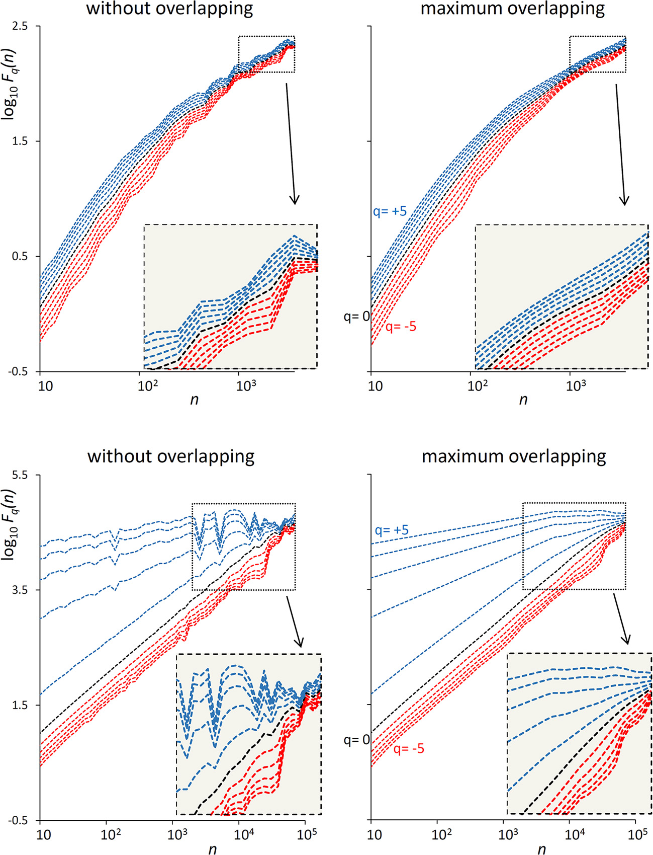 The examples of Figure 1 illustrate the reduction of estimation variability and the related computational costs when using maximum overlapping. In the example of a first-order autoregressive process generated by white Gaussian noise (Figure 1, Upper), the variability of the Fq(n) estimate without overlapping might suggest the presence of a focus at the larger scales. A focus should not be present, because at scales larger than the cut-off frequency the dynamics is determined by white noise. Actually, when the Fq(n) curves are estimated with maximally overlapped blocks, they run in parallel (see inset) with slope α close to 0.5 at the largest scale. In the example of a random series with multifractal Cauchy distribution (Figure 1, Lower), the large variability of the estimate without overlapping makes it difficult to identify the scale where the focus occurs and may completely hide possible crossover points between n = 103 and n = 104 for positive q. These drawbacks are largely mitigated by using maximum overlapping but at the cost of an increased computational load that may lead to unacceptable calculation times for long series.