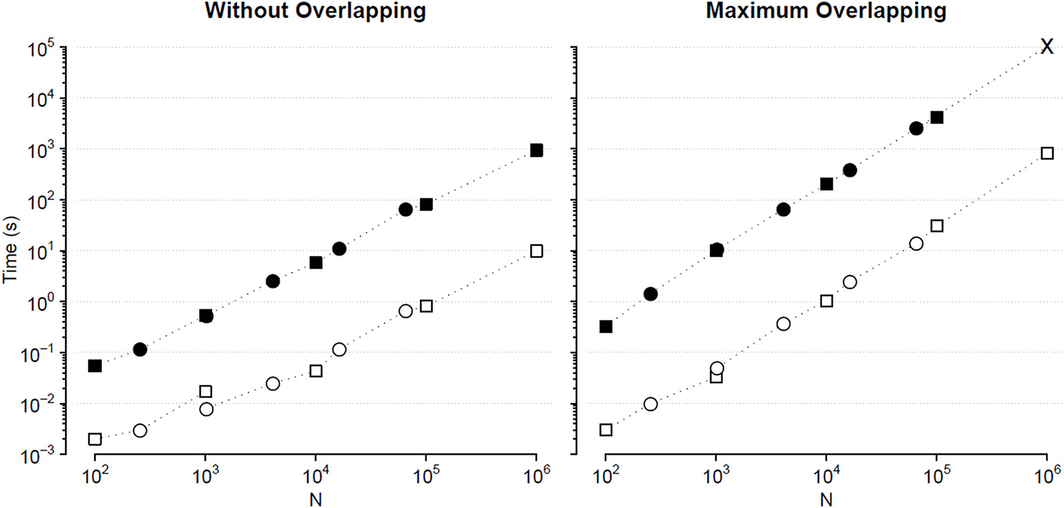 Comparison of Fq(n) calculation times (sum of DFA1 and DFA2) for series of length N. Times for analyzing {wbi} (square) and binomial cascade (circle) series (see text) by traditional (solid symbols) and fast MF DFA algorithm (open symbols): average of 10 runs on a personal computer with Intel i7-7600U CPU at 2.80 GHz, 16 GB RAM and Samsung MZVLW1T0HMLH-000L7 hard disk. As the series length, N, increases, the number of block sizes, n, also increases remaining constant the block-size density of four n values per decade. The calculation time of the traditional algorithm for maximum overlapping and N = 106 has been extrapolated (cross symbol).