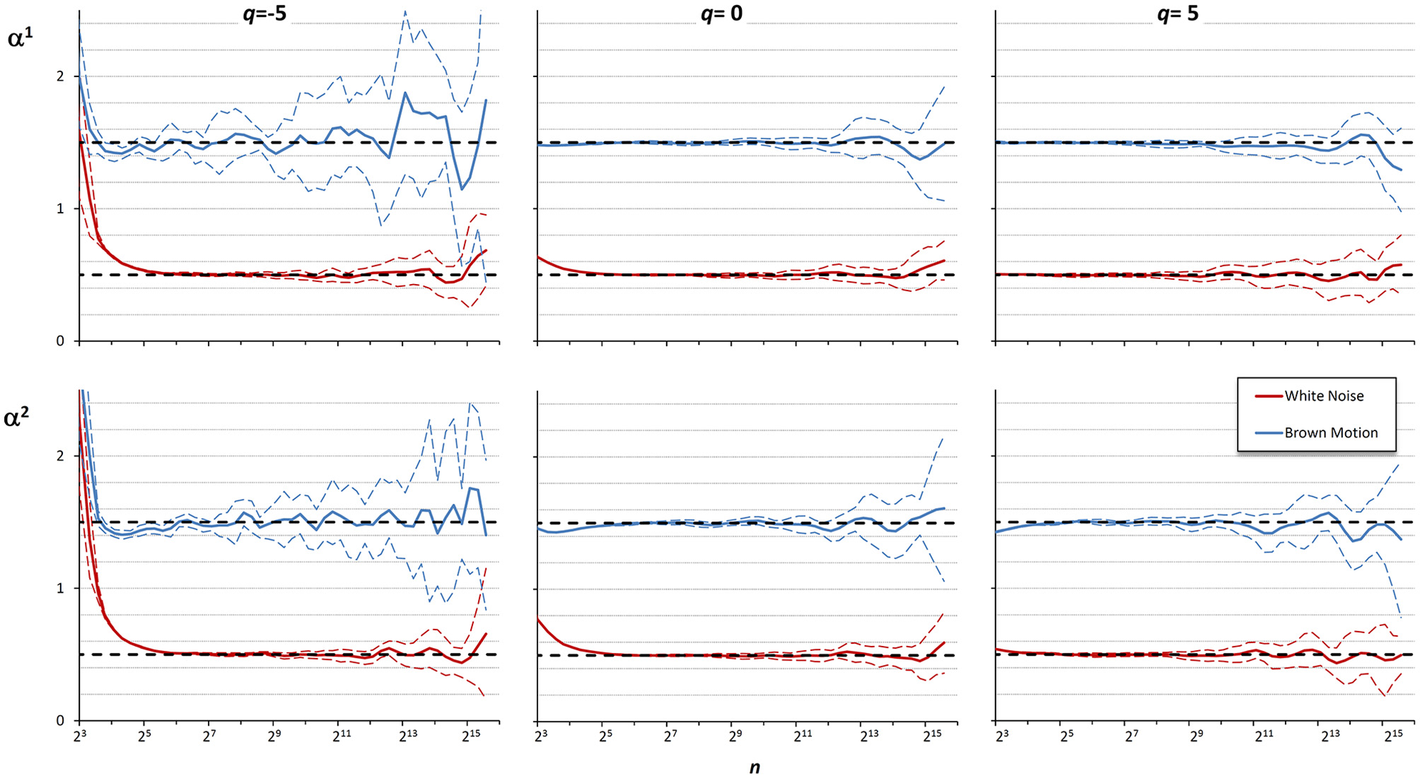 Multifractal multiscale coefficients by DFA1, α1, and by DFA2, α2. Values as derivative of log Fq(n) vs. log n with maximally overlapped blocks: mean ± SD for 10 white noises and 10 Brownian motions. Dashed horizontal lines represent the theoretical value for white noise (=0.5) or Brownian motion (=1.5).