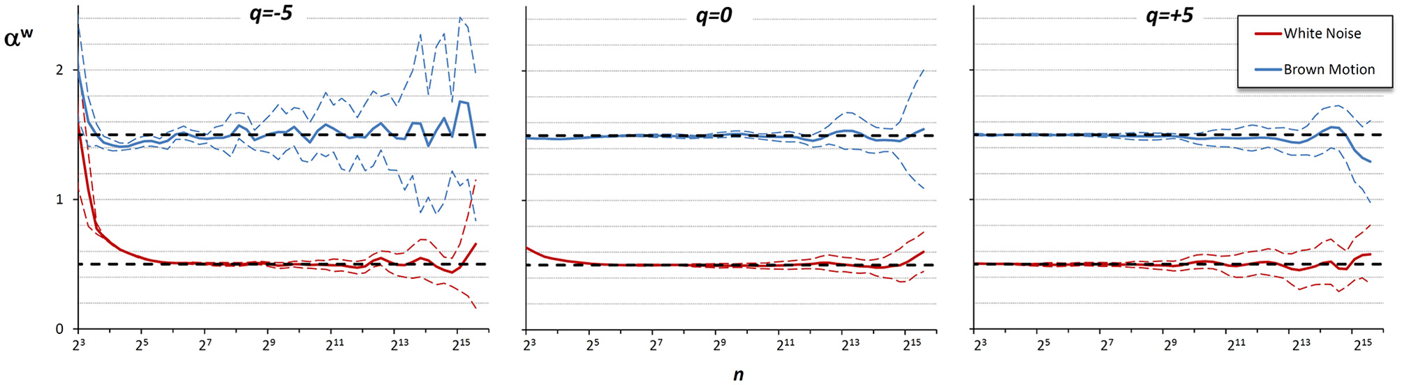 These findings suggest that if the time series is composed by fractional Gaussian noises and/or fractional Brownian motions, DFA1 is preferable to DFA2 at the shorter scales, while at the larger scales the choice may depend on the sign of q, and if q = 0 averaging the DFA1 and DFA2 coefficients might improve the estimate. Accordingly, we combined the estimates by DFA1, α1(q,n), and by DFA2, α2(q,n), defining a weighted average, αw(q,n), when q = −5, as: