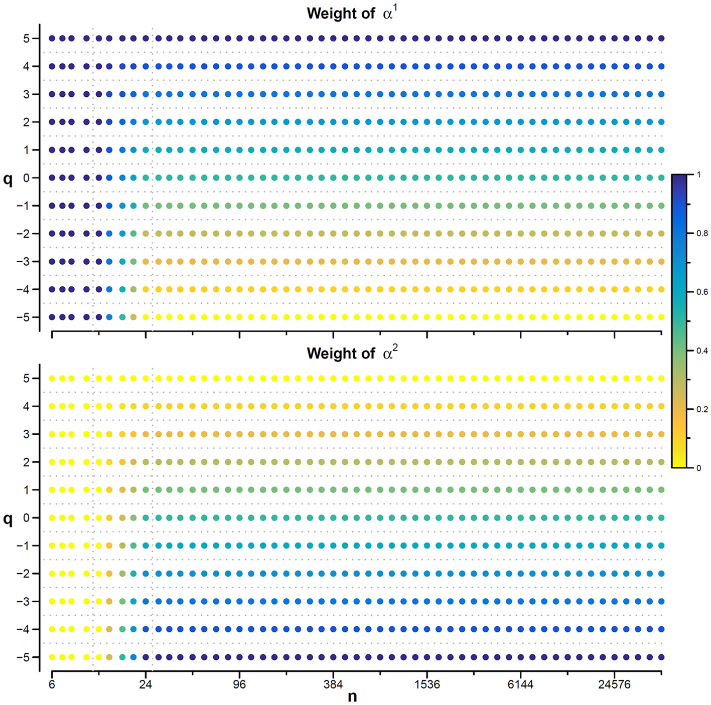 Weights for combining DFA1 and DFA2 estimates. The weighted estimate, αw(q,n), is a linear combination of DFA1 coefficients, α1(q,n), and DFA2 coefficients, α2(q,n), and it is proposed if there are no specific reasons to prefer one of the two detrending orders and if the time-series dynamics is assumed to be composed by fractional Gaussian noises or fractional Brownian motions. The weights, based on Equations (23), range between 0 (yellow) and 1 (dark blue). When n ≤ 12, αw = α1 for all q values; when n≥24, αw = α1 for q = 5, αw = α2 for q = −5, and α1 and α2 weights change linearly with q between −5 and +5 so that αw is the average between α1 and α2 for q = 0. The α1 and α2 weights change linearly also with n between 12 and 24.