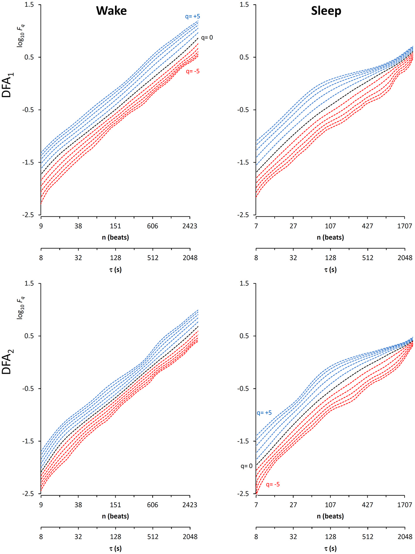In this context, our fast algorithm is expected to improve existing methods by calculating α(q,n) surfaces with higher scale resolution and lower estimation variability, thanks to its ability to provide estimates with maximally overlapped blocks in short time. As an example in the field of heart rate variability, we compare multiscale multifractality during nighttime sleep and during daytime activities in a healthy male volunteer. We derived R-R interval series from a 24-h electrocardiogram sampled at 250 Hz. We compared Fq(n) functions calculated on two segments of 4 h duration, one selected during daytime, from 2 p.m. to 6 p.m. (Wake condition), one during nighttime after sleep onset, from 2 a.m. to 6 a.m. (Sleep condition). The mean heart rate was 50 bpm during Sleep (N = 12,000 beats) and 71 bpm during Wake (N = 17,000 beats). Four premature beats were identified visually and removed, and Fq(n) functions were derived by DFA1 and DFA2 with maximally overlapped blocks. Since the mean heart rate is lower in Sleep than in Wake condition, the same block of n beats corresponds to different time scales, in seconds, during Sleep and during Wake. Therefore, the fluctuation functions were plotted vs. the corresponding temporal scale τ, in seconds, by multiplying n by the mean R-R interval. Figure 8 shows that Wake and Sleep have different fluctuations functions, increasing with τ as parallel lines in Wake and converging to a focus at the longest scales in Sleep. This suggests a multifractal behavior (i.e., different slopes for different q), more evident at some scales (i.e., a multiscale dynamics), during sleep. The Fq(τ) functions by DFA1 and by DFA2 appear similar: this confirms a previous observation on 24-h heart rate recordings (Gieraltowski et al., 2012) and does not suggest the presence of long-term trends that make one of the two detrending orders preferable. Therefore, we derived the surface of multifractal multiscale coefficients by applying the weighted approach of Equations (23). Figure 9 illustrates the resulting α(q,τ) surfaces. During daytime, the surface represents a relatively monofractal process with multiscale dynamics, i.e., α depends more on τ than on q. By contrast, during sleep, the surface also shows a strong dependence on q at some scales, like at τ = 1250 s, where it ranges between α = 2.05 at q = −5 and α = 0.9 at q = +5.