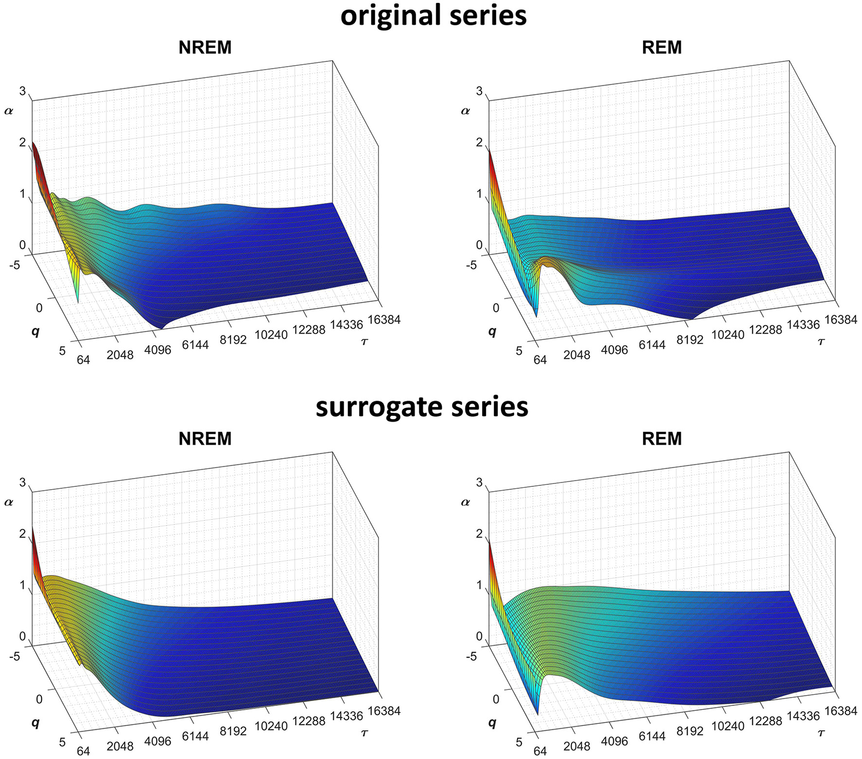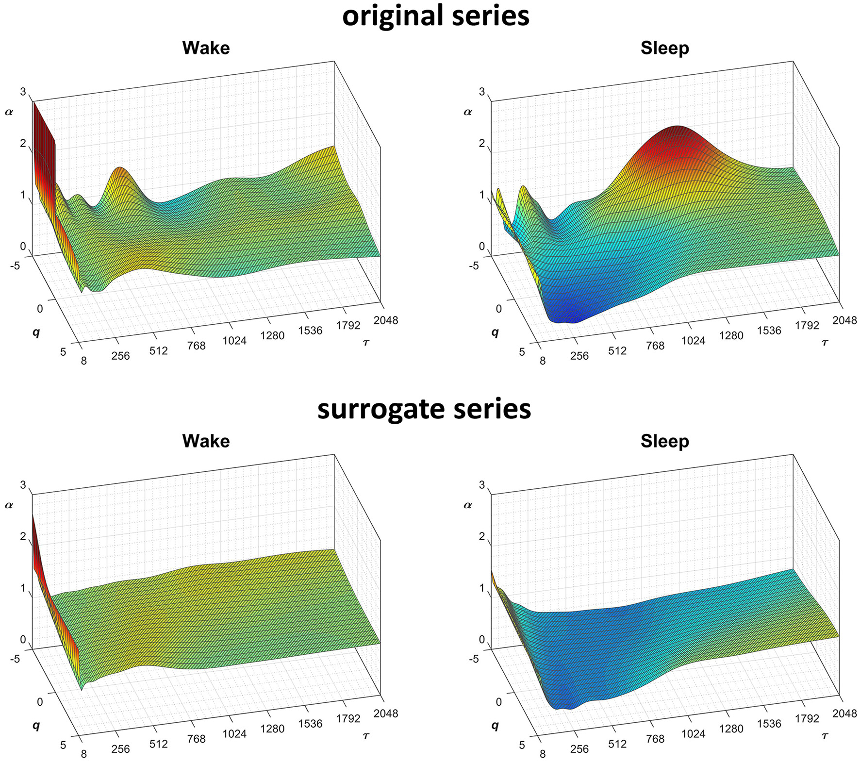 Fractal structures in physiological systems may arise from nonlinear chaotic dynamics or may be due to linear spectral features. We tested whether the α(q,n) surfaces we estimated for the heart-rate series actually reflect an underlying nonlinear dynamics with the method of surrogate data analysis (Theiler et al., 1992). For this purpose, we generated a dataset of 100 Fourier-phase shuffled time series (Schreiber and Schmitz, 2000) from each of the two recordings. The surrogate series have the same power spectrum of the original recording but a random phase. We calculated α(q,n) for the “Wake” and “Sleep” surrogate datasets. The average of each dataset is plotted in Figure 9 for comparison with the original data. Multifractal structures evident in the original series are absent in the surrogate data.